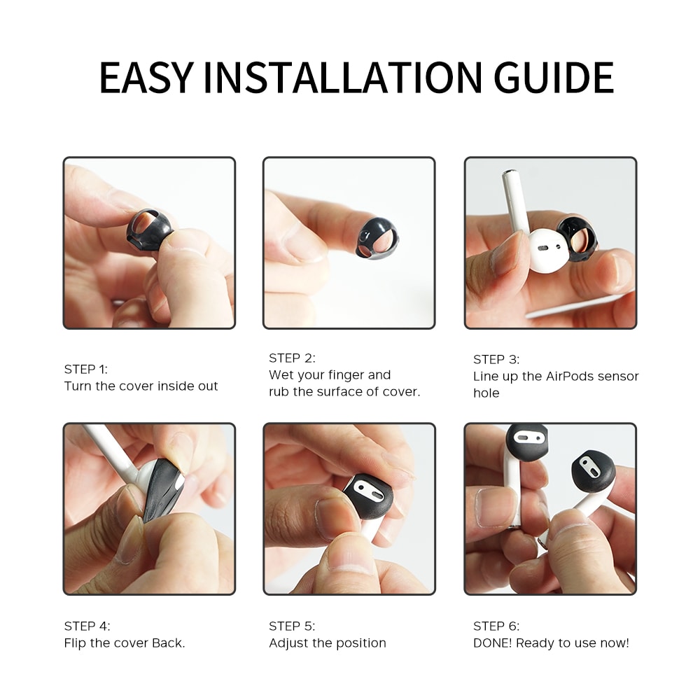 Set med tre par öronsnäckor i silikon till Apple AirPods från Ahastyle. Det tunna silikonet gör att hörlurarna sitter ordentligt och bekvämt i öronen oavsett aktivitet. Skydden är väldigt tunna för att inte kännas klumpiga att ha i öronen, vilket gör att du även kan ha på skydden kvar på snäckorna när de sitter i laddningsfodralet.