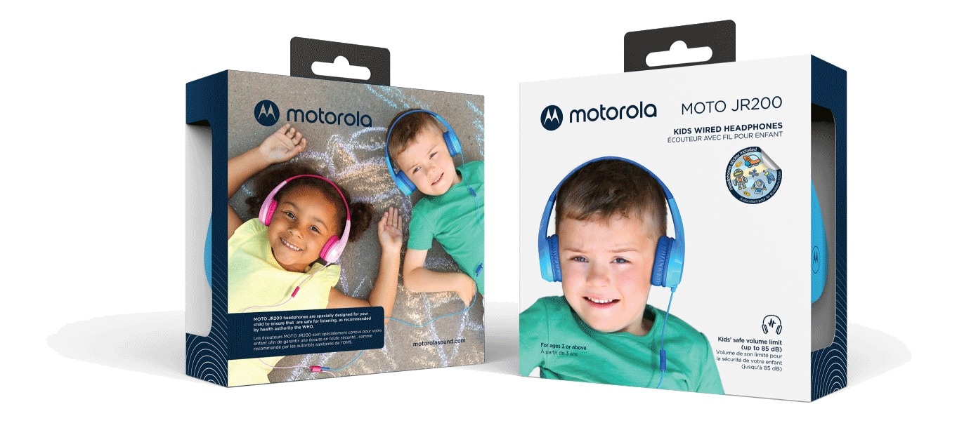 On-ear hörlurar för barn från Motorola med ljudbegränsning på 85 decibel. Hörlurarna kan justeras i storlek vilket gör att de även passar när barnet växer. Hörlurarna kan enkelt kopplas till en smartphone eller surfplatta med 1 meter långa 3,5mm-kabeln. Hörlurarna har inbyggd mikrofon på sladden.