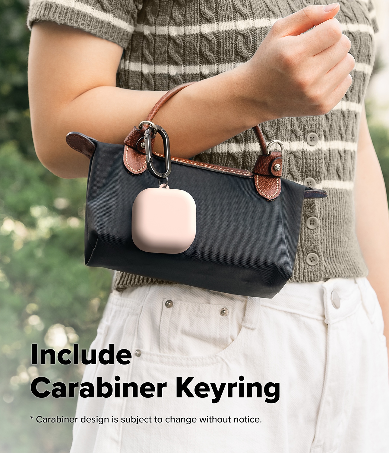 Stilrent silikonskal med karbinhake till Samsung Galaxy Buds 4 Pro från Ringke. Skalet har en tunn design men är fortfarande stötdämpande för att skydda mot skador. Det är tillverkat av högkvalitativt flytande silikon med en yta som både känns lyxig och ger bra skydd. Skalet har en tvålagersdesign med en stark polykarbonatram på insidan och silikon på utsidan.