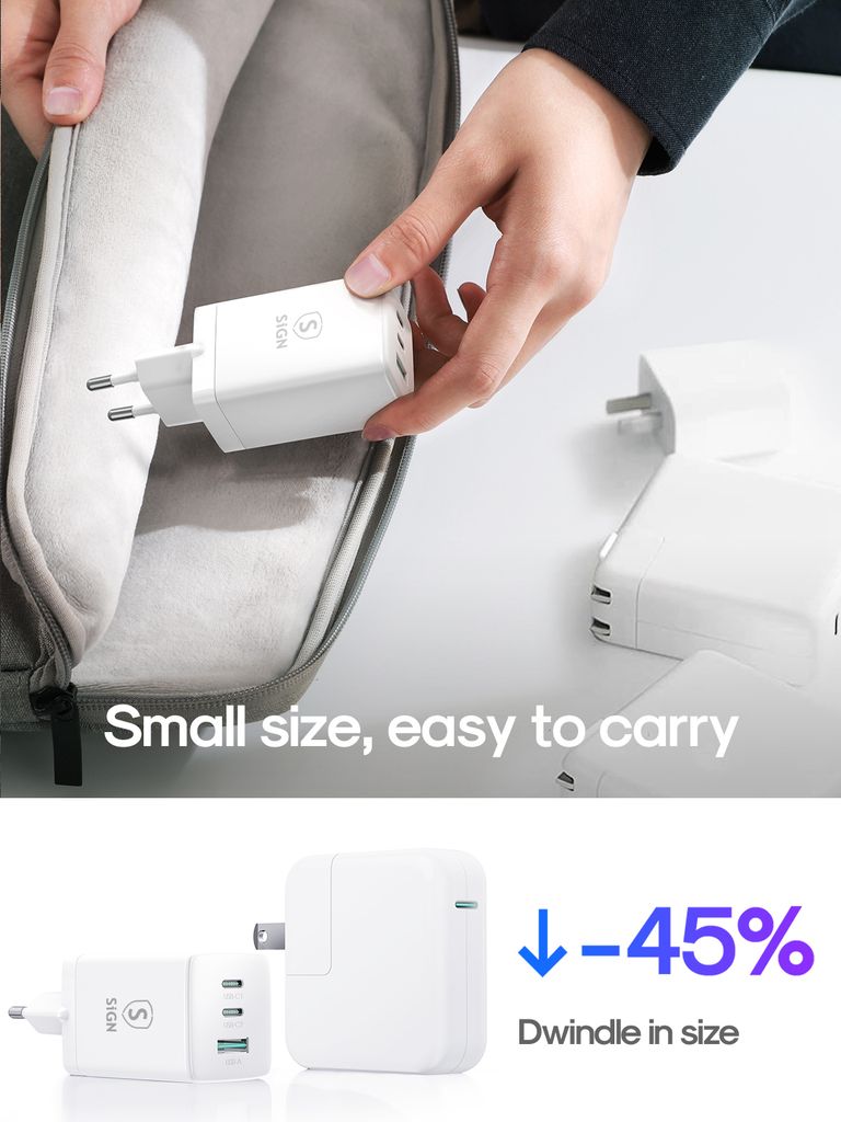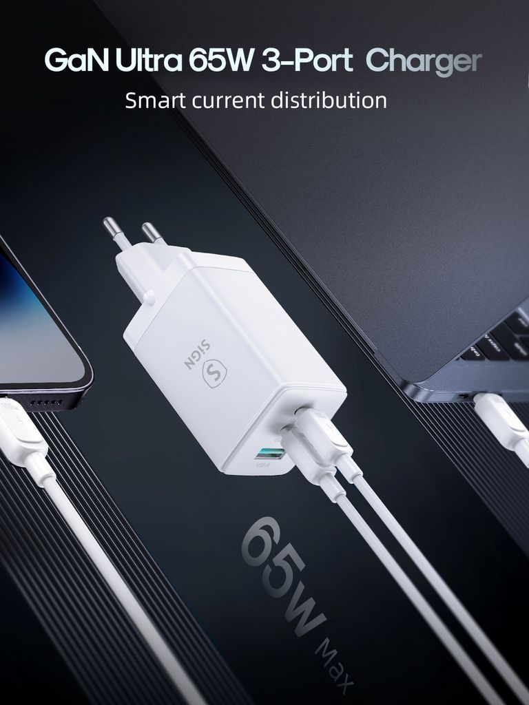 SiGN GaN 65W snabbladdare är en kraftfull och kompakt väggladdare med två USB-C-portar och en USB-A-port för effektiv laddning av flera enheter samtidigt. Med en total uteffekt på upp till 65W är den lämplig för laptops, surfplattor, mobiltelefoner och andra USB-enheter.