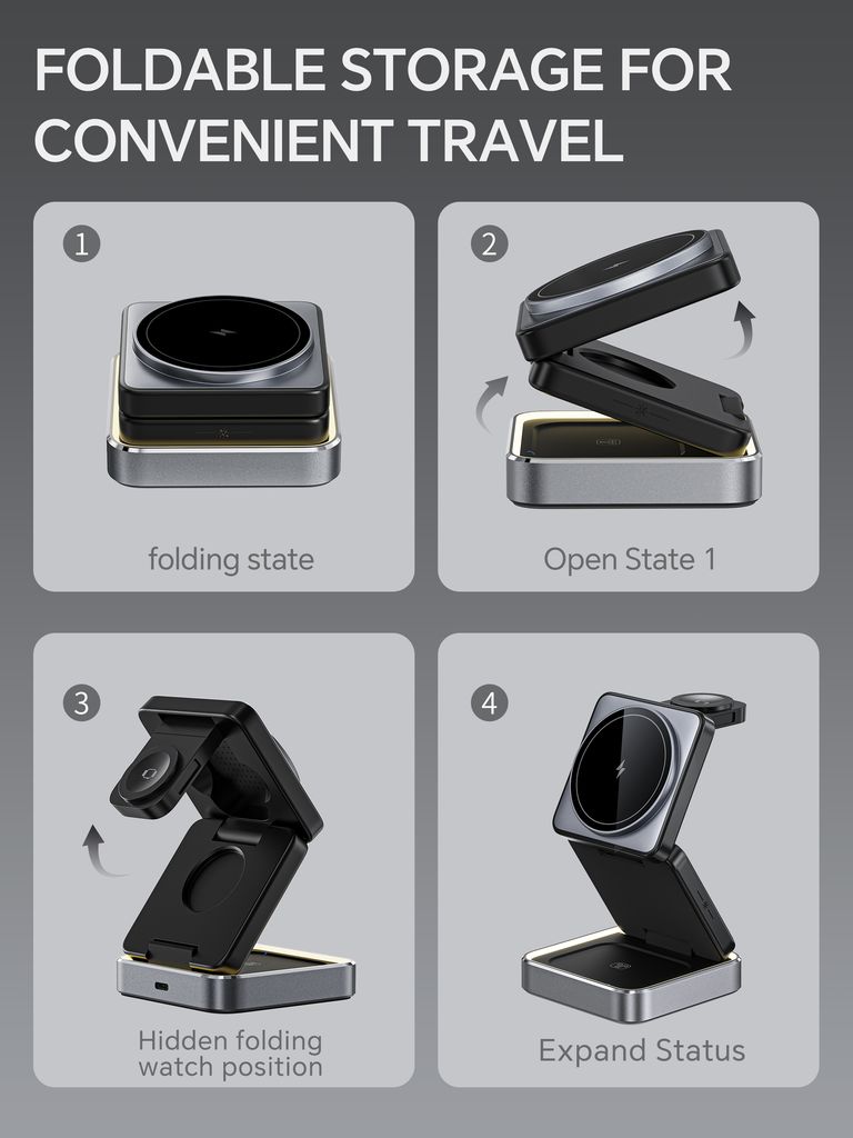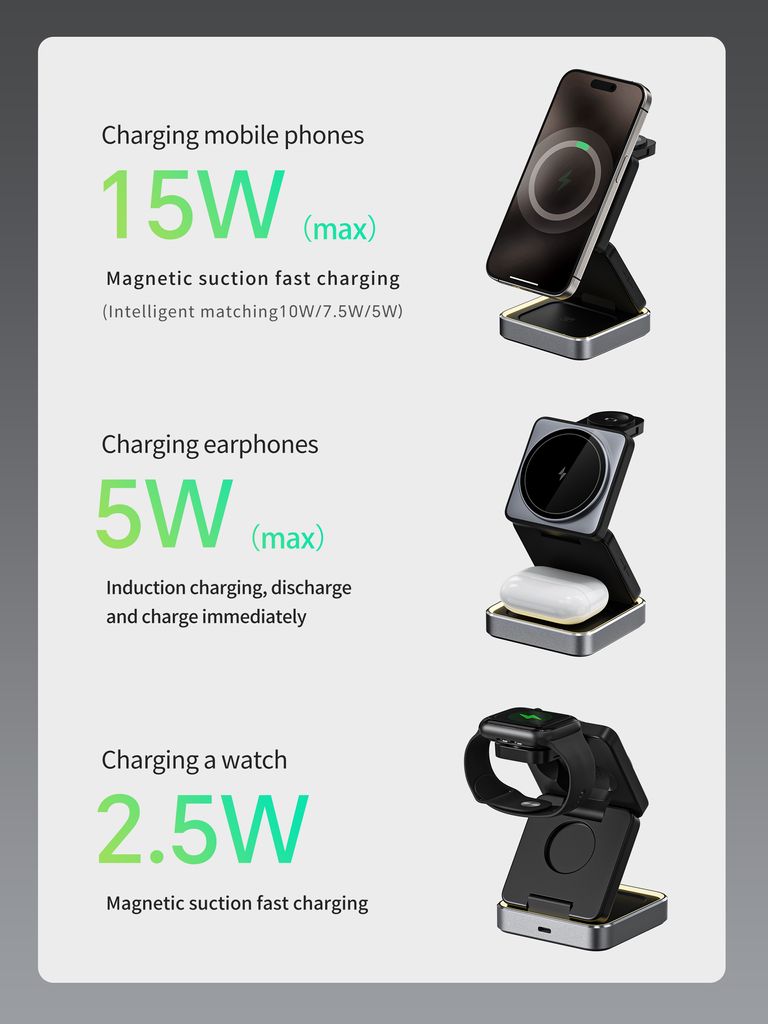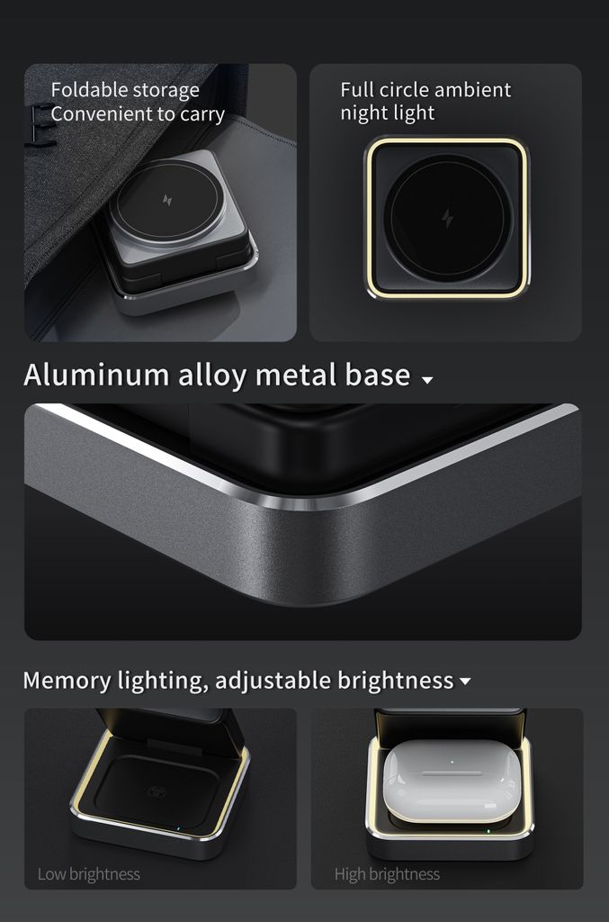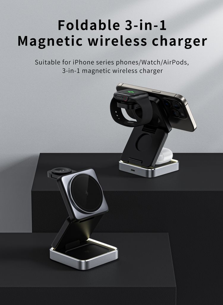 SiGNs 3-i-1 hopfällbara trådlösa magnetiska laddningsstation 15W är en praktisk och kompakt lösning för att ladda din smartphone, Apple Watch och trådlösa hörlurar samtidigt. Den vikbara designen gör laddningsstationen enkel att ta med på resor eller använda både hemma och på kontoret, samtidigt som den sparar plats på skrivbordet.