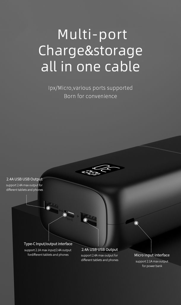 <p>Powerbanken är utrustad med en USB-C-port och två USB-A-portar, vilket ger dig flexibilitet att ladda flera enheter samtidigt. USB-A-portarna stöder upp till 2.4A för snabb och effektiv laddning av din mobiltelefon eller surfplatta. Powerbanken kan dessutom laddas via både USB-C och Micro-USB, vilket gör den enkel och smidig att använda oavsett vilken kabel du har tillgänglig.</p>