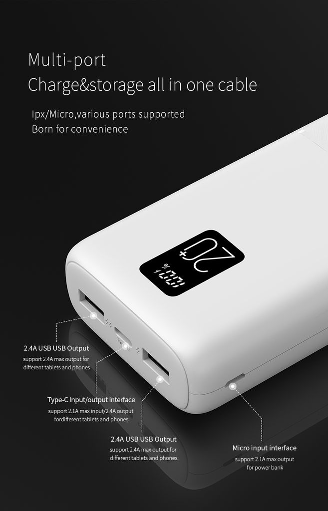 Powerbanken har en USB-C-port och två USB-A-portar, vilket gör att du kan ladda upp till tre enheter samtidigt. Den stöder snabbladdning och har inbyggda säkerhetsskydd för trygg och stabil laddning. LED-indikatorerna visar tydligt batterinivån.