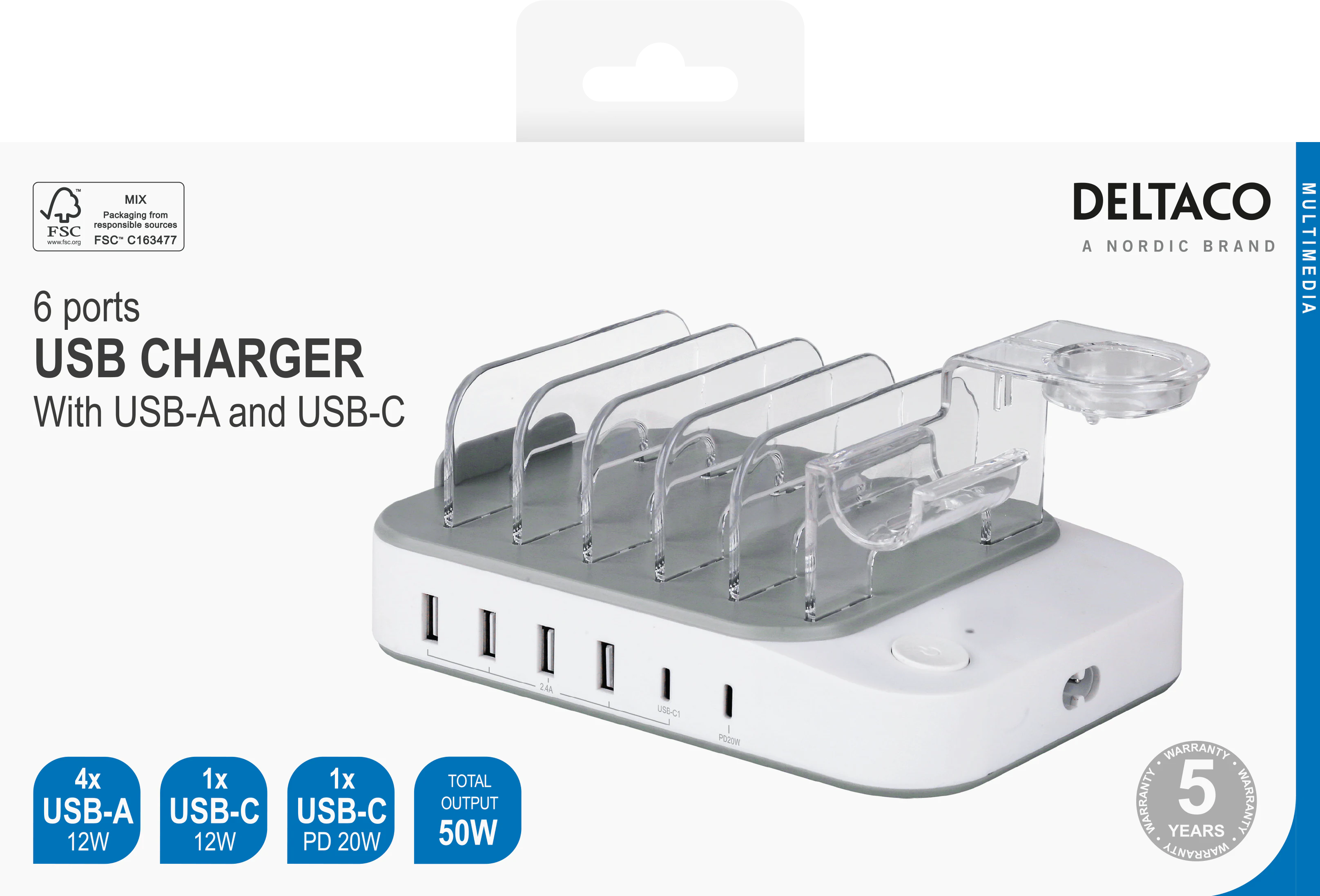 61080Laddningsstation för 6-enheter 4x USB-A, 2x USB-C 50W Vithttps://www.phonelife.se/laddare-sladdar/tillbehor-laddare-kablar/laddningsstation-for-6-enheter-4x-usb-a-2x-usb-c-50w-vit?channelCountry=SEhttps://www.phonelife.se/pub_images/original/DPS-0203-1.pngInStock599SEK/laddare-sladdar/tillbehor-laddare-kablarDeltaco<p>Med denna USB-laddningsstation kan du ladda upp till sex enheter samtidigt på ett smidigt och organiserat sätt. Laddningsstationen är utrustad med fyra USB-A-portar och två USB-C-portar, vilket gör den till en flexibel lösning för smartphones, surfplattor, trådlösa hörlurar, smartklockor och andra USB-enheter. Den totala uteffekten på upp till 50 W ger stabil och effektiv laddning för hela familjens prylar.</p>