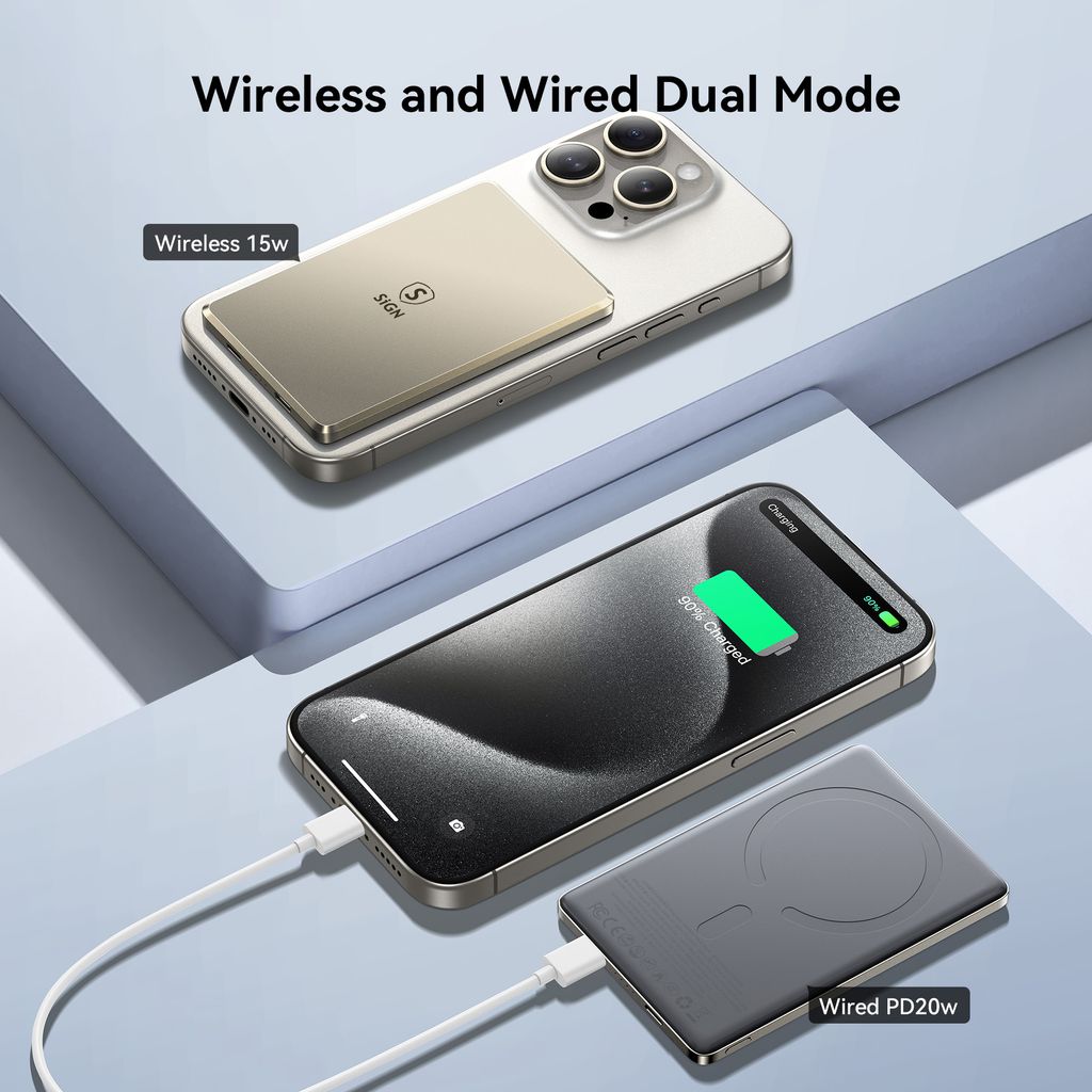 <p>Powerbanken stöder Power Delivery upp till 20W via USB-C samt trådlös laddning upp till 15W. Den kan ladda upp till tre enheter samtidigt via trådlös laddning och kabelanslutning. LED-indikatorn visar tydligt batterinivå och laddningsstatus. Lågströmsläget möjliggör säker laddning av mindre enheter som hörlurar, smartklockor och aktivitetsarmband.</p>