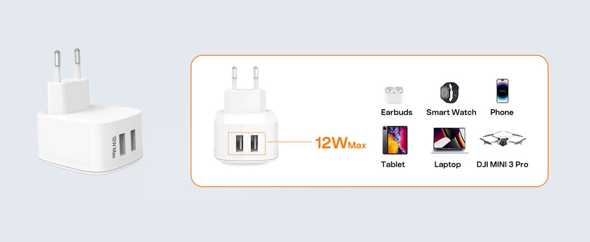 Väggladdare med 2 x USB-A är en praktisk och effektiv lösning för laddning av mobiltelefoner, surfplattor och andra enheter som drivs via USB-A. Laddaren gör det möjligt att ladda upp till två enheter samtidigt vilket gör den lämplig både i hemmet och på resan. Den totala kapaciteten på 4,8 A ger stabil och pålitlig laddning i vardagen.