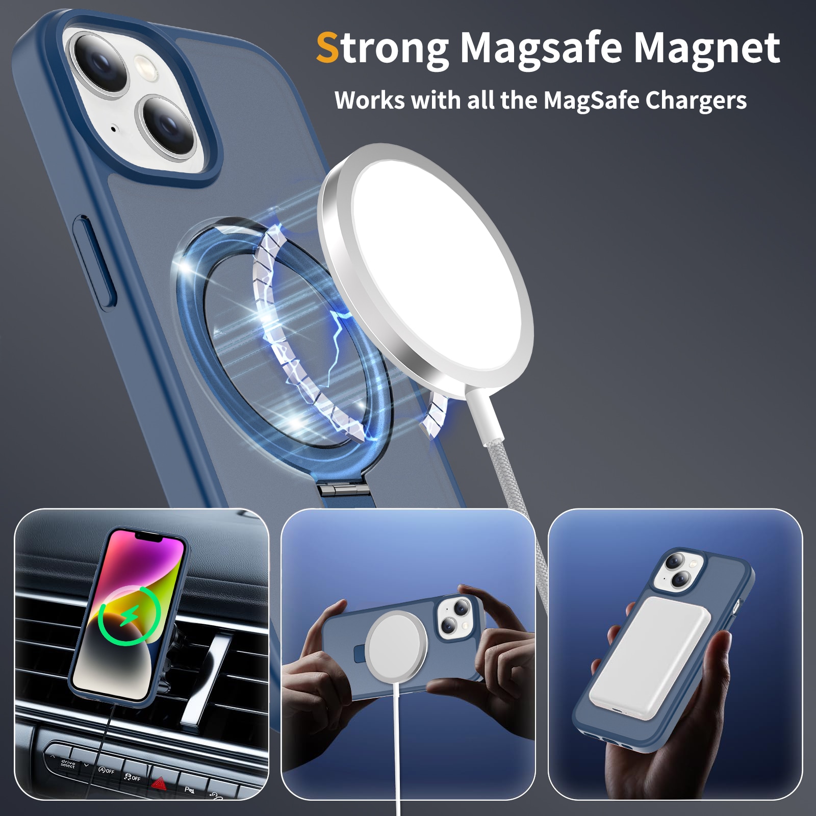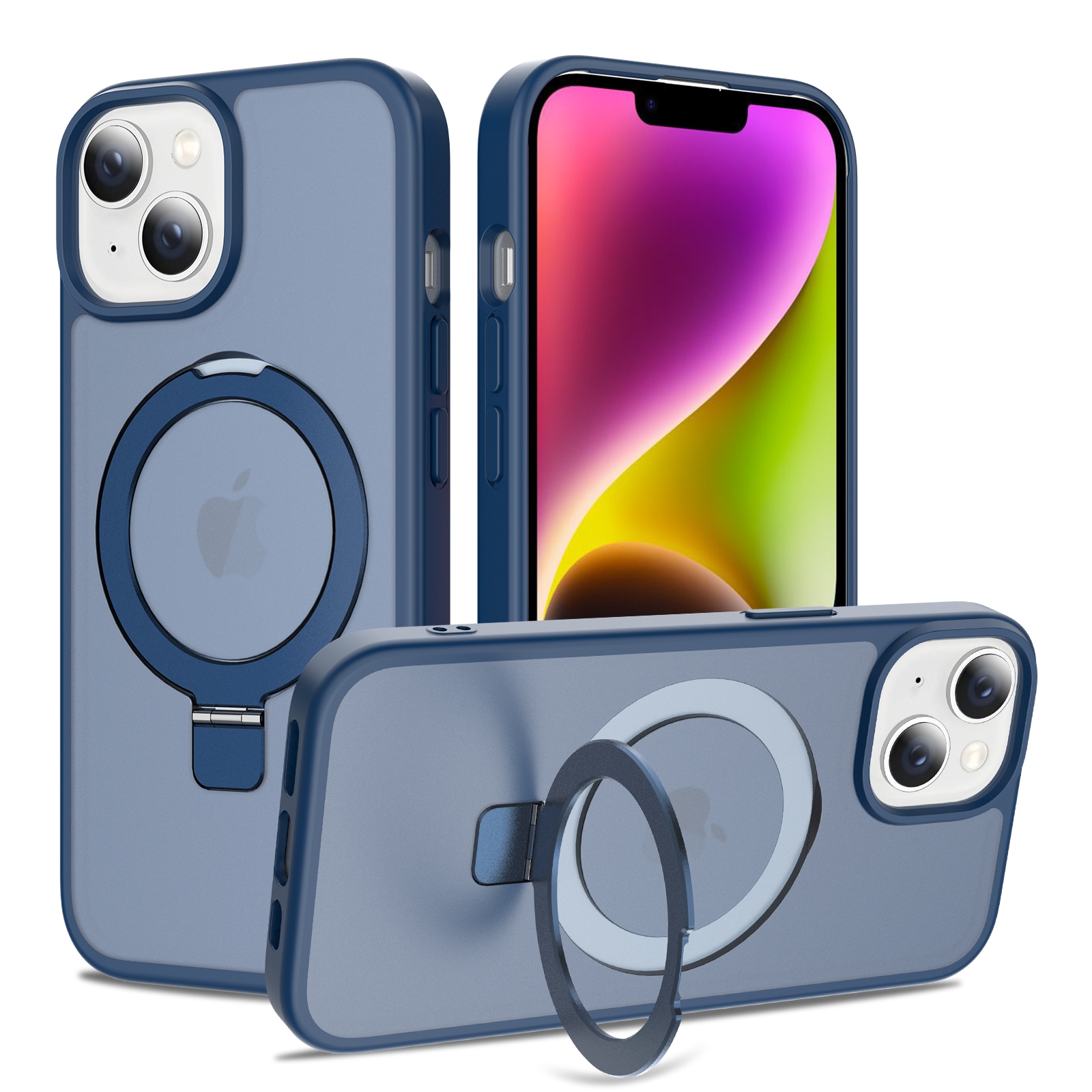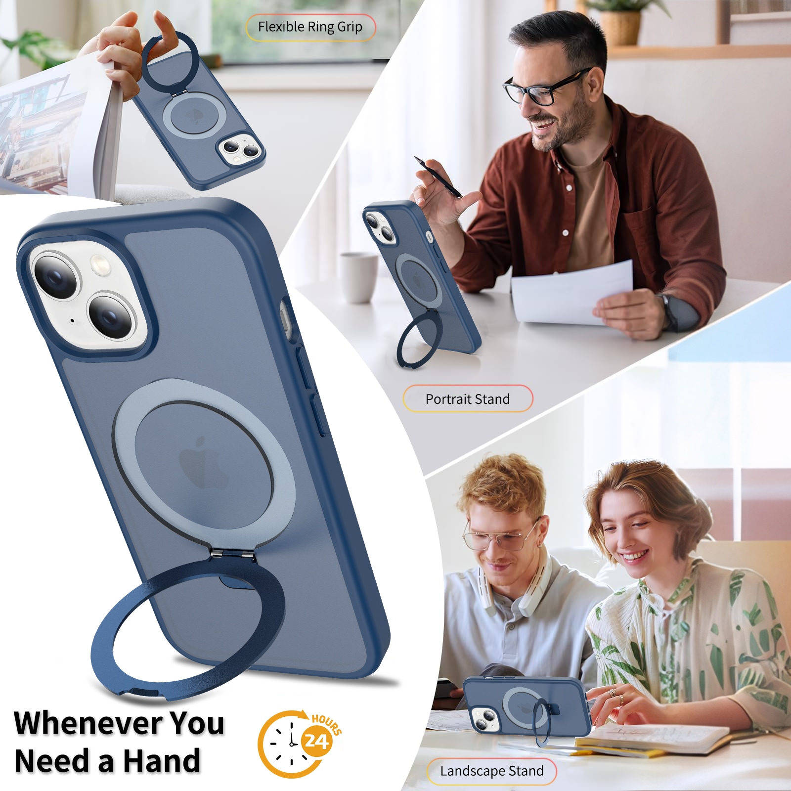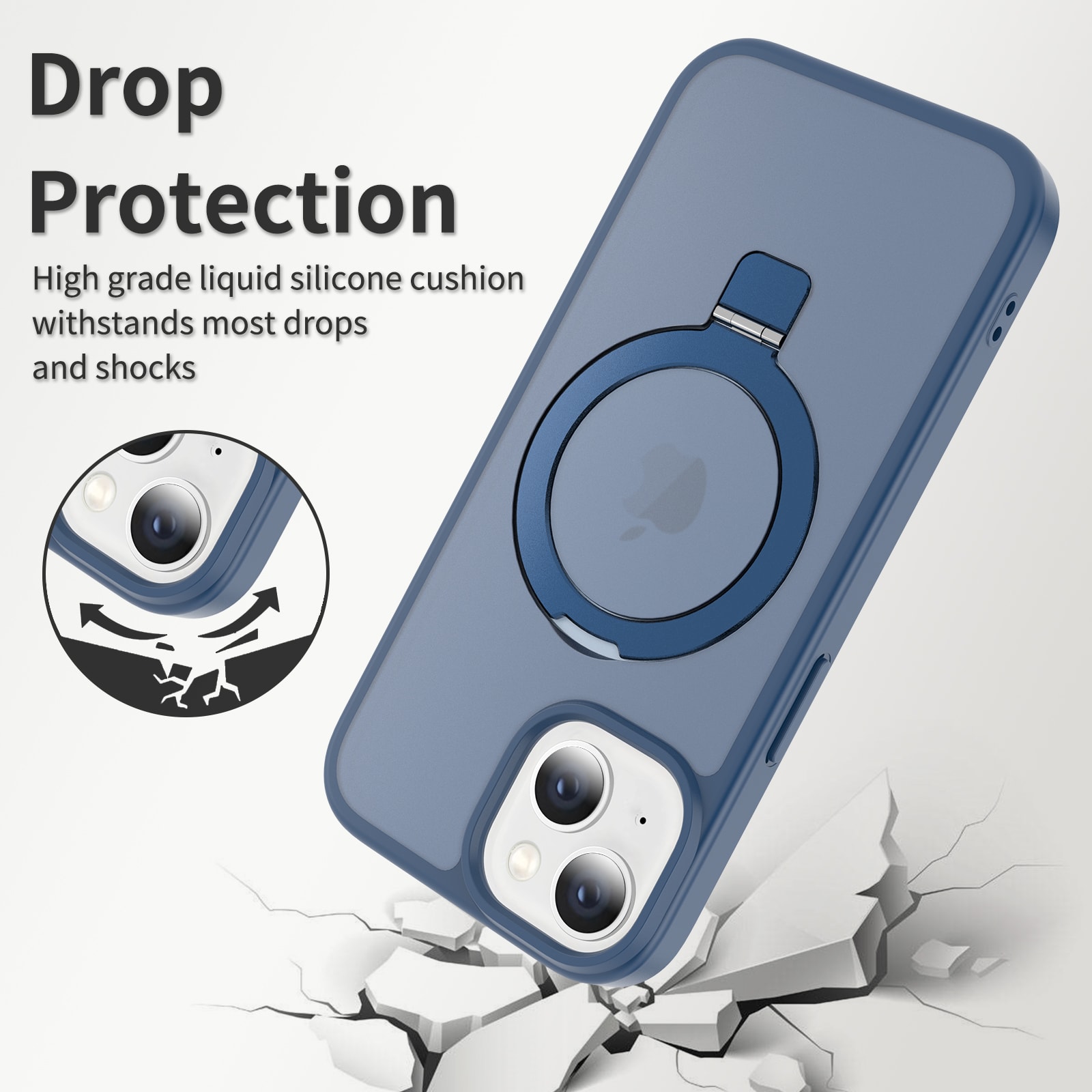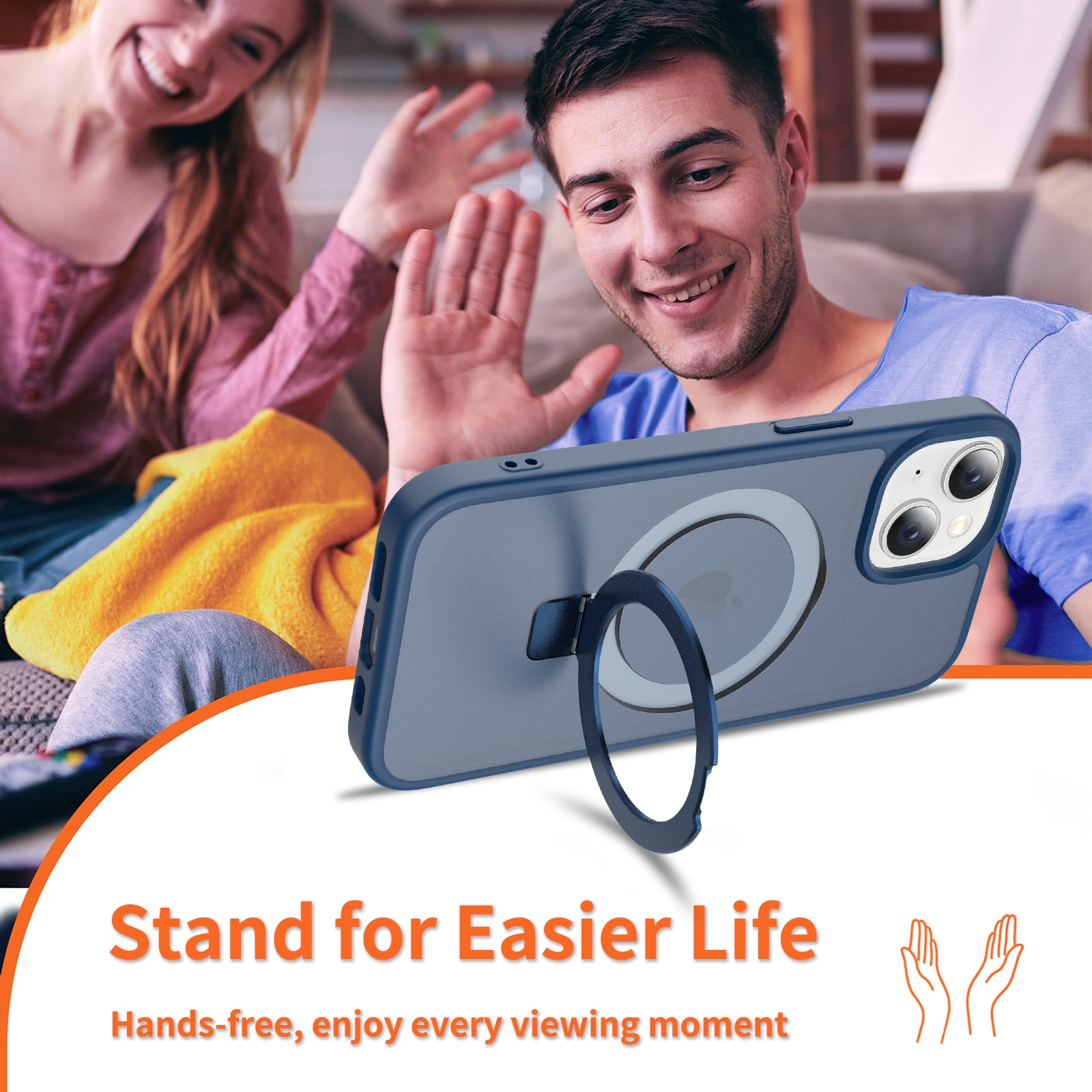 Mobilskal med utfällbar magnetisk ring till Apple iPhone 13. För bästa skydd mot stötar och fall är skalet tvådelat med en TPU-kärna och ett hölje i hårdplast. Ringen på baksidan är magnetisk och kan användas tllsammans med MagSafe-kompatibla tillbehör såsom laddare och korthållare. Ringen kan även bilda ett ställ för att se på film, klipp eller för att spela.