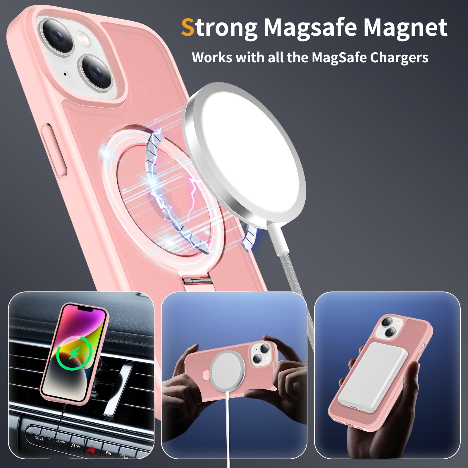 Mobilskal med utfällbar magnetisk ring till Apple iPhone 13. För bästa skydd mot stötar och fall är skalet tvådelat med en TPU-kärna och ett hölje i hårdplast. Ringen på baksidan är magnetisk och kan användas tllsammans med MagSafe-kompatibla tillbehör såsom laddare och korthållare. Ringen kan även bilda ett ställ för att se på film, klipp eller för att spela.