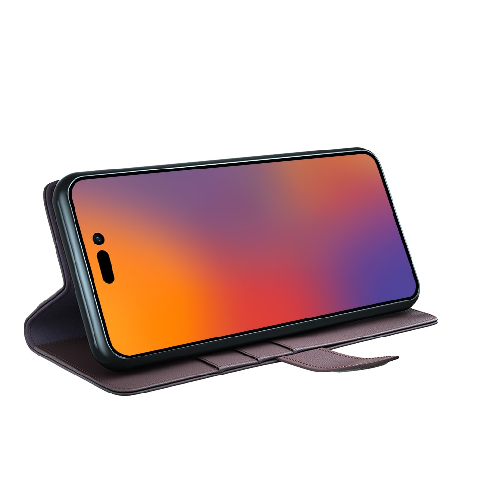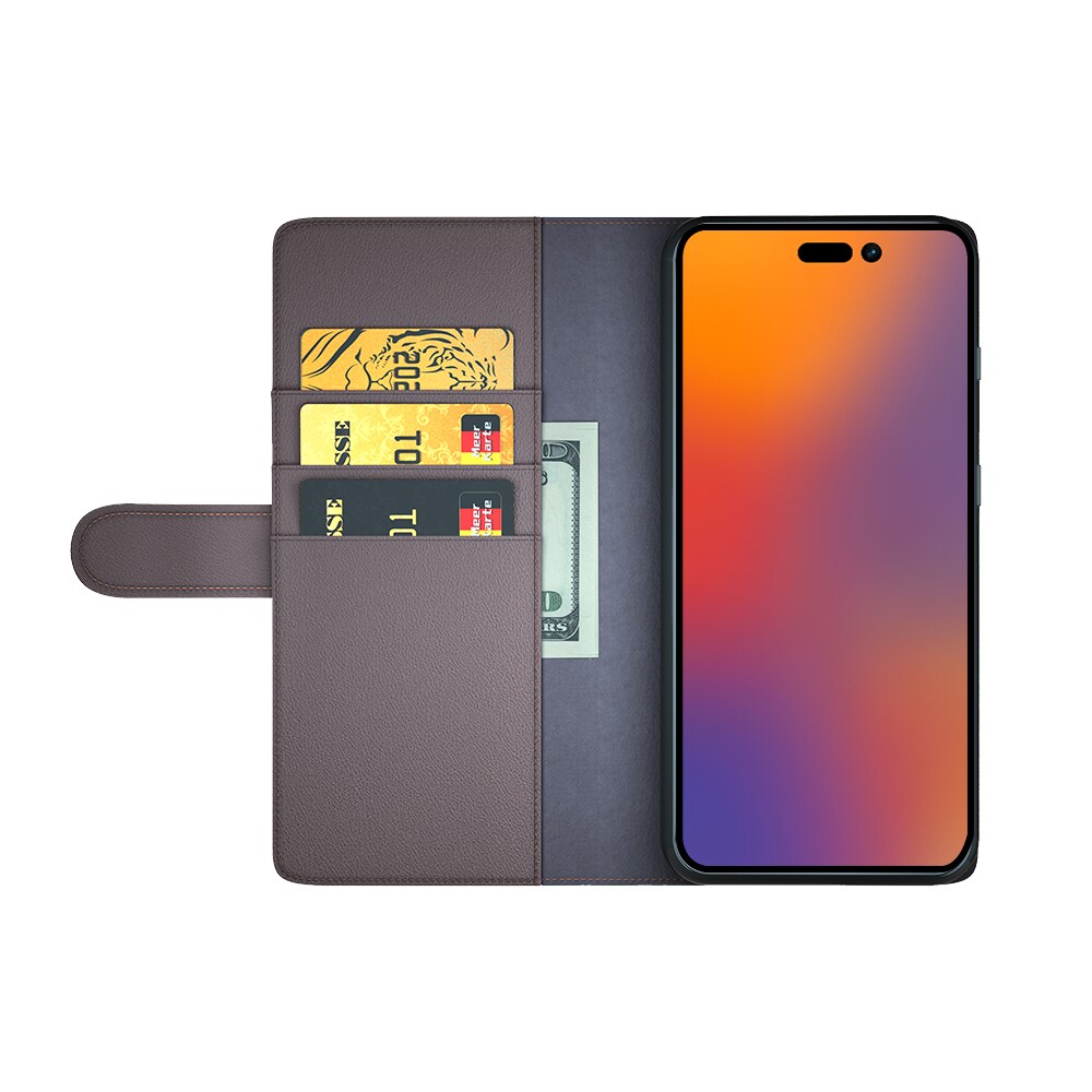 Mobilfodral i äkta läder till Apple iPhone 14 Pro Max. Fodralet skyddar runt hela din telefon och har en rymlig plånbok på insidan av locket. Plånboken är rymlig med tre kortfack och en sedelficka.
