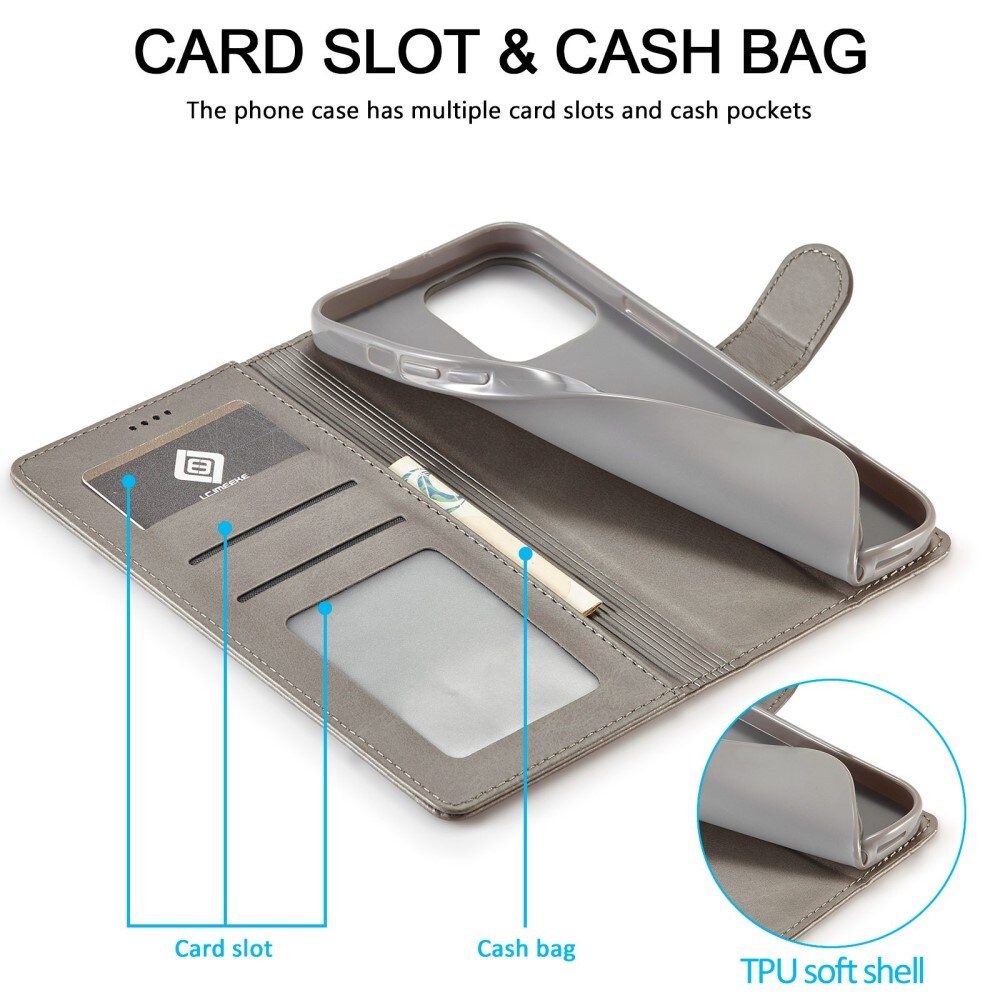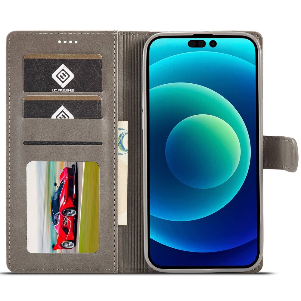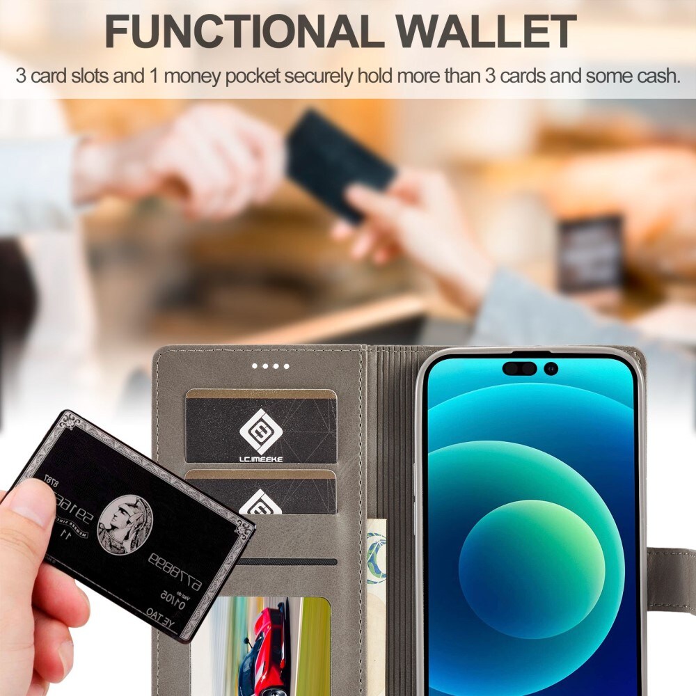 Plånboksfodral från LC.IMEEKE till iPhone 14 Pro. Stilrent fodral som skyddar telefonen mot skador och ger dig smart förvaring för din plånbok.