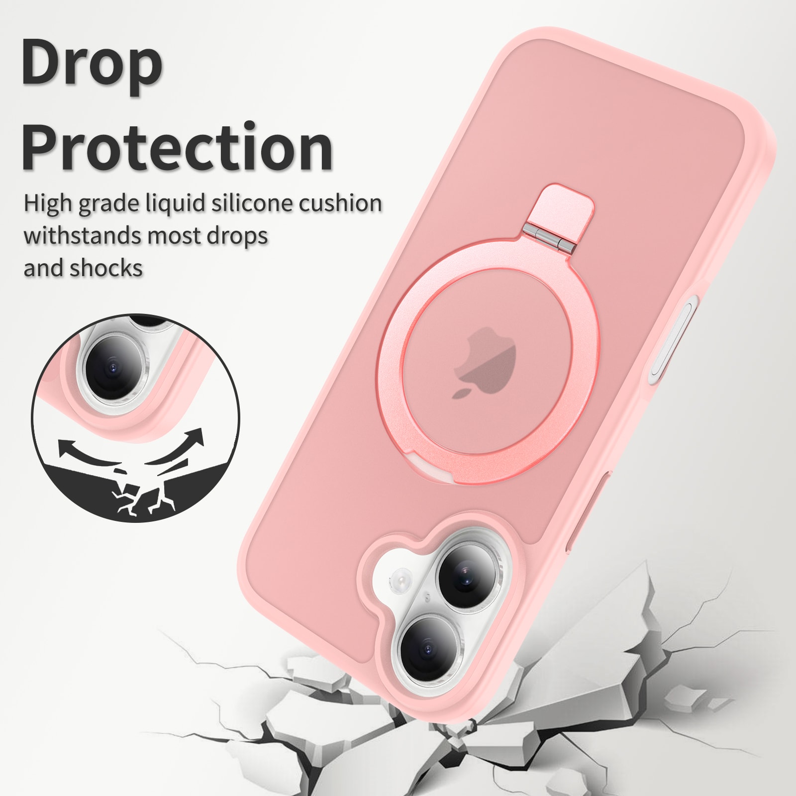 Mobilskal med utfällbar magnetisk ring till Apple iPhone 16. För bästa skydd mot stötar och fall är skalet tvådelat med en TPU-kärna och ett hölje i hårdplast. Ringen på baksidan är magnetisk och kan användas tllsammans med MagSafe-kompatibla tillbehör såsom laddare och korthållare. Ringen kan även bilda ett ställ för att se på film, klipp eller för att spela.