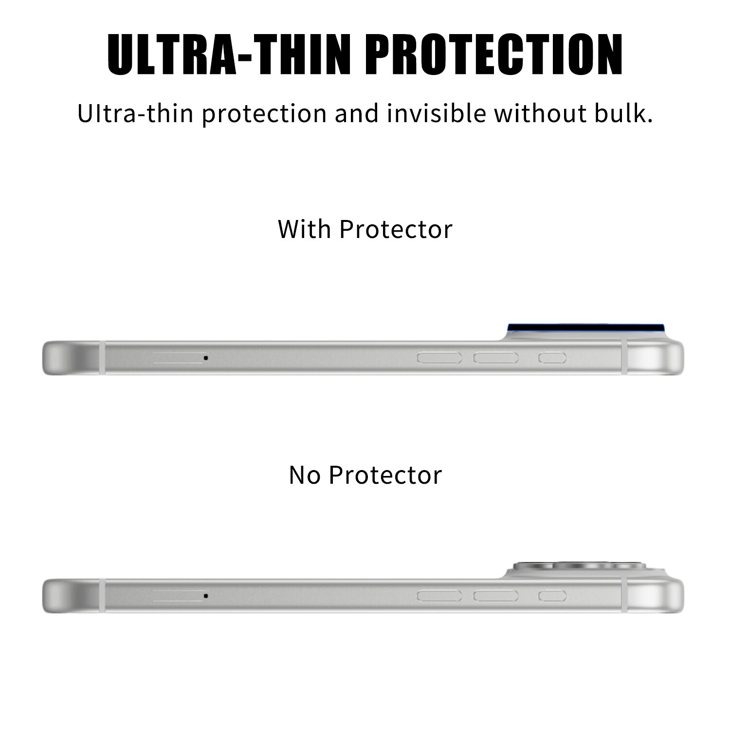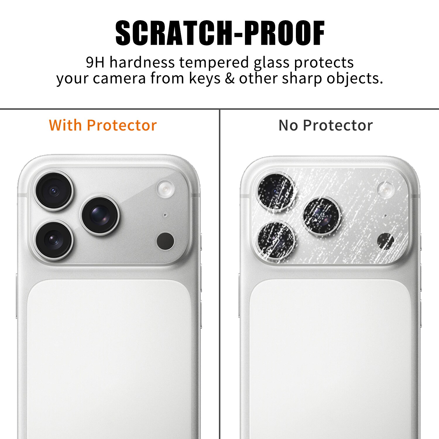 Kameralinsskydd i härdat glas till Apple iPhone 17 Pro Max, utformat för att skydda kameramodulen mot repor, stötar och yttre slitage. Skyddet är heltäckande och täcker både linser och kamerahus. När skyddet är monterat är det diskret och påverkar inte telefonens utseende.