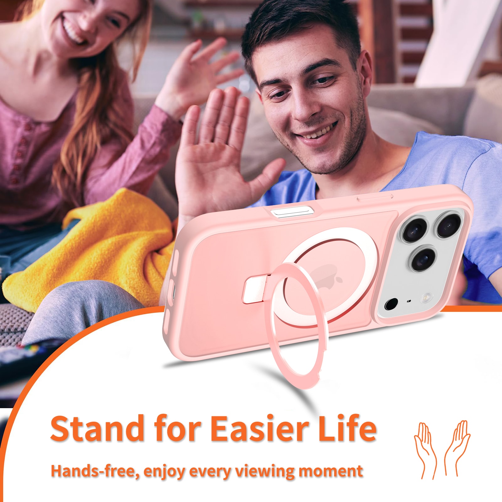 - Utfällbar MagSafe-ring som kan användas som mobilställ