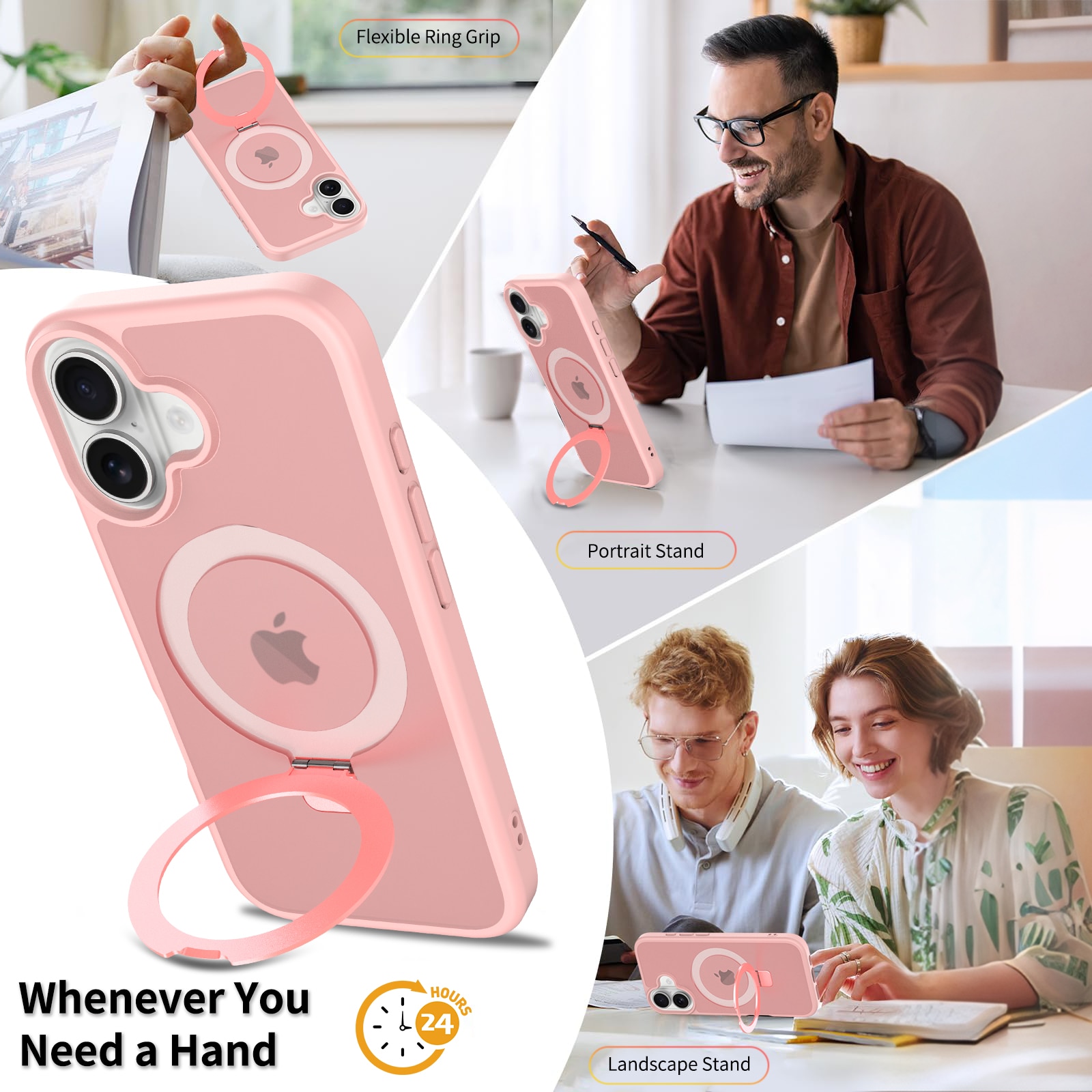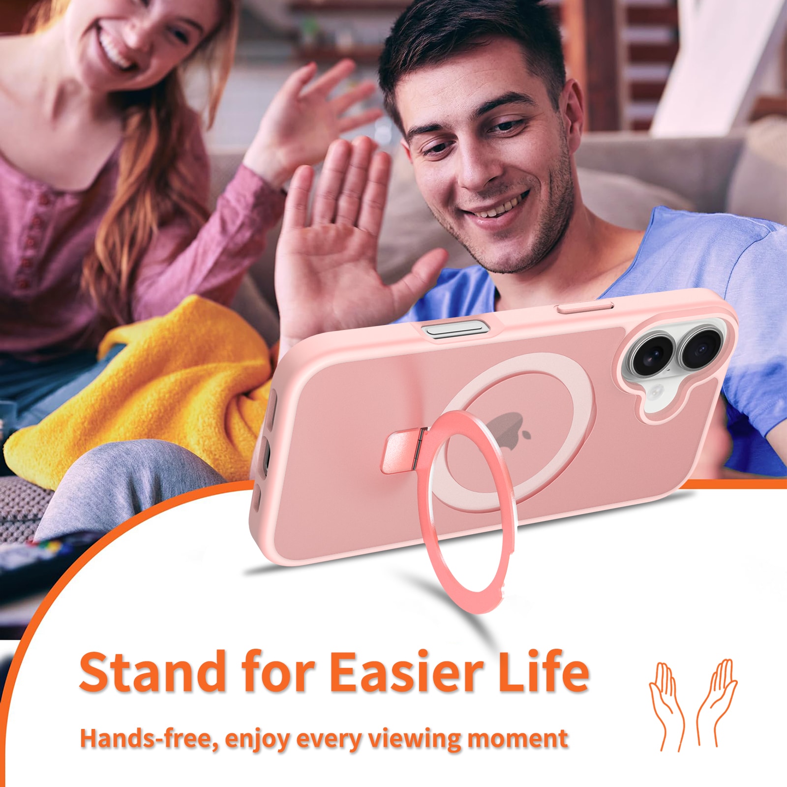 - Utfällbar MagSafe-ring som kan användas som mobilställ
