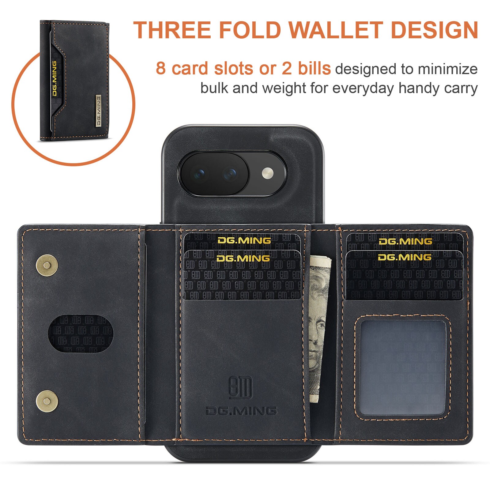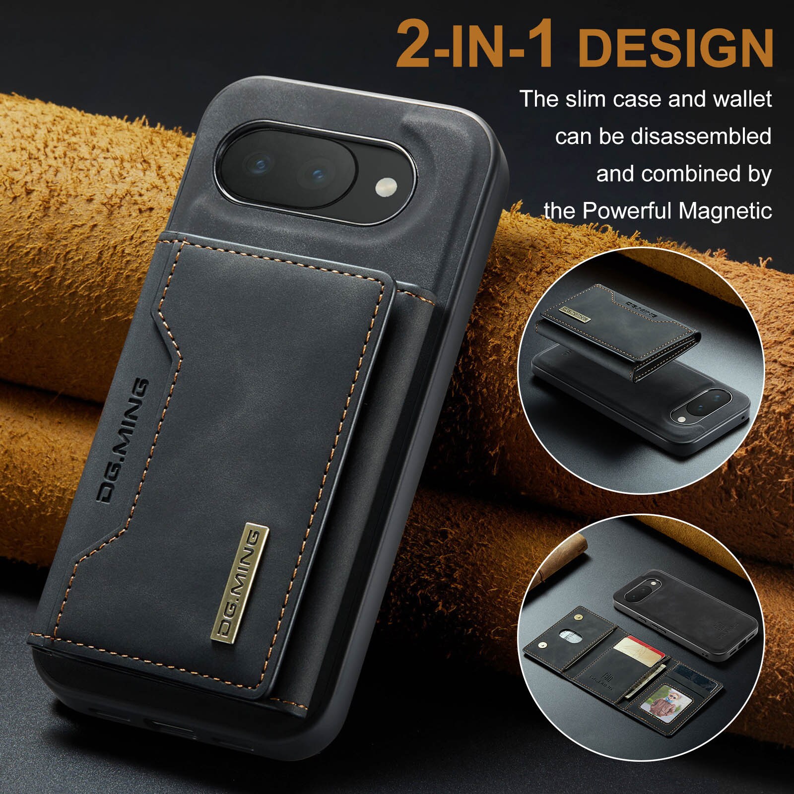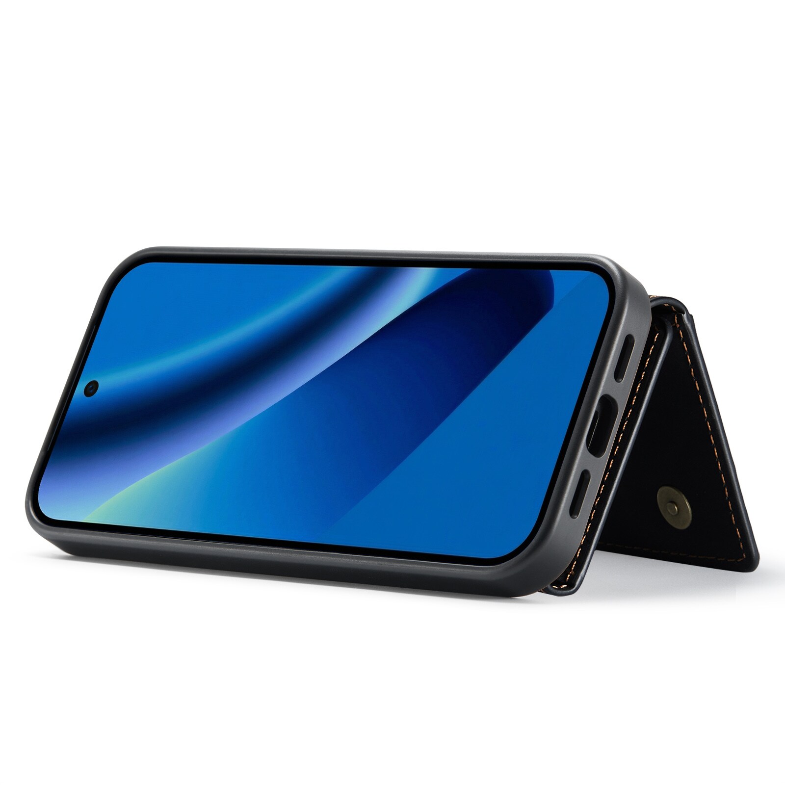 Läderskal till Google Pixel 10a med tillhörande plånbok. Plånboken fästs med magneter på baksidan av skalet och kan enkelt plockas av när man inte behöver den. Genom att fälla ut plånboken så kan den även fungera som stativ så att du smidigt kan kolla på film eller videoklipp.