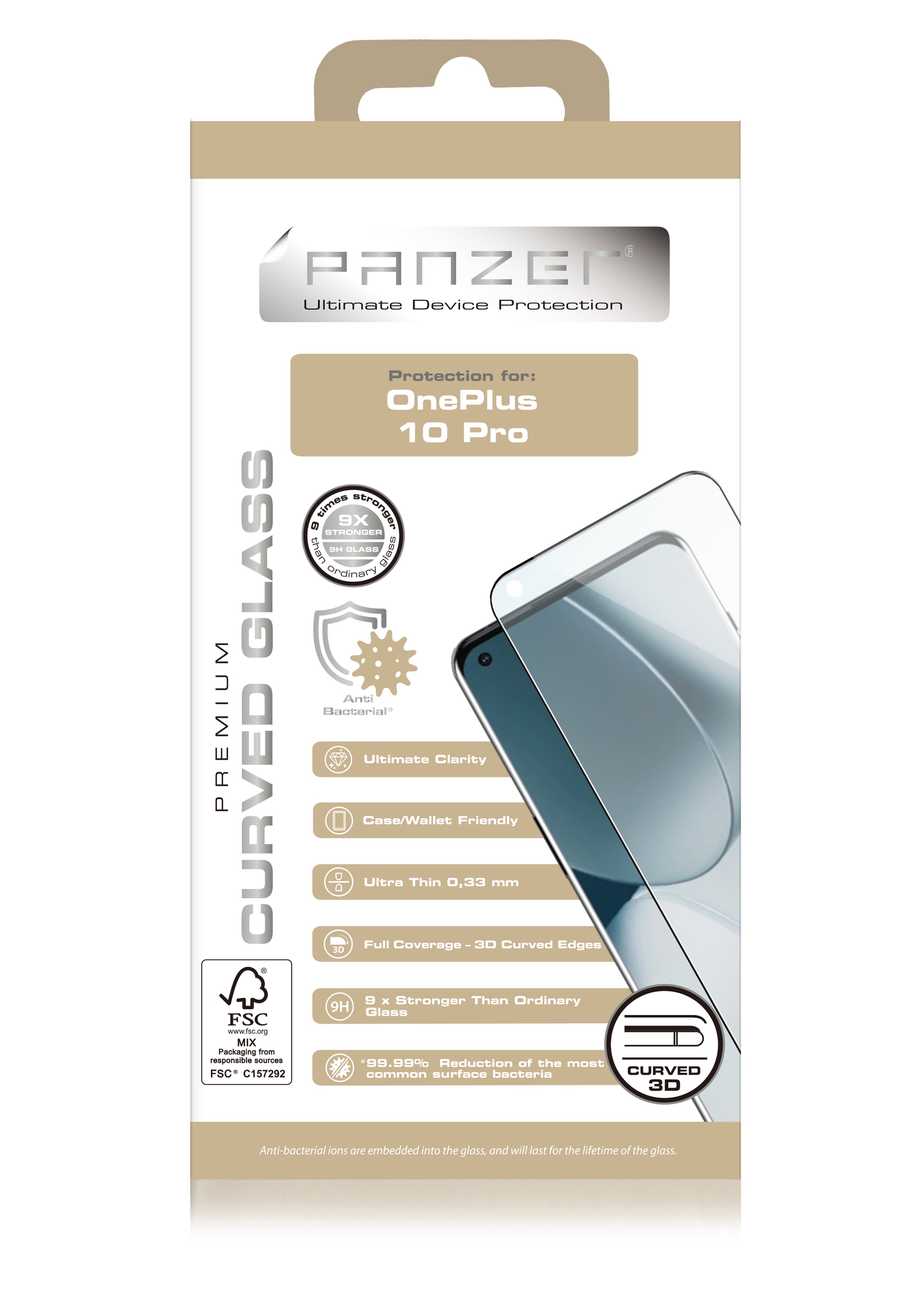 Panzer Premium Curved Glass är ett skärmskydd i silikatglas till OnePlus 10 Pro. Silikatglas är det hårdaste glaset som finns och ger ett 9 gånger bättre skydd än vanligt glas (9H). Skärmskyddet har även en antibakteriell behandling som dödar 99,99% av alla bakterier som kommer i kontakt med det.