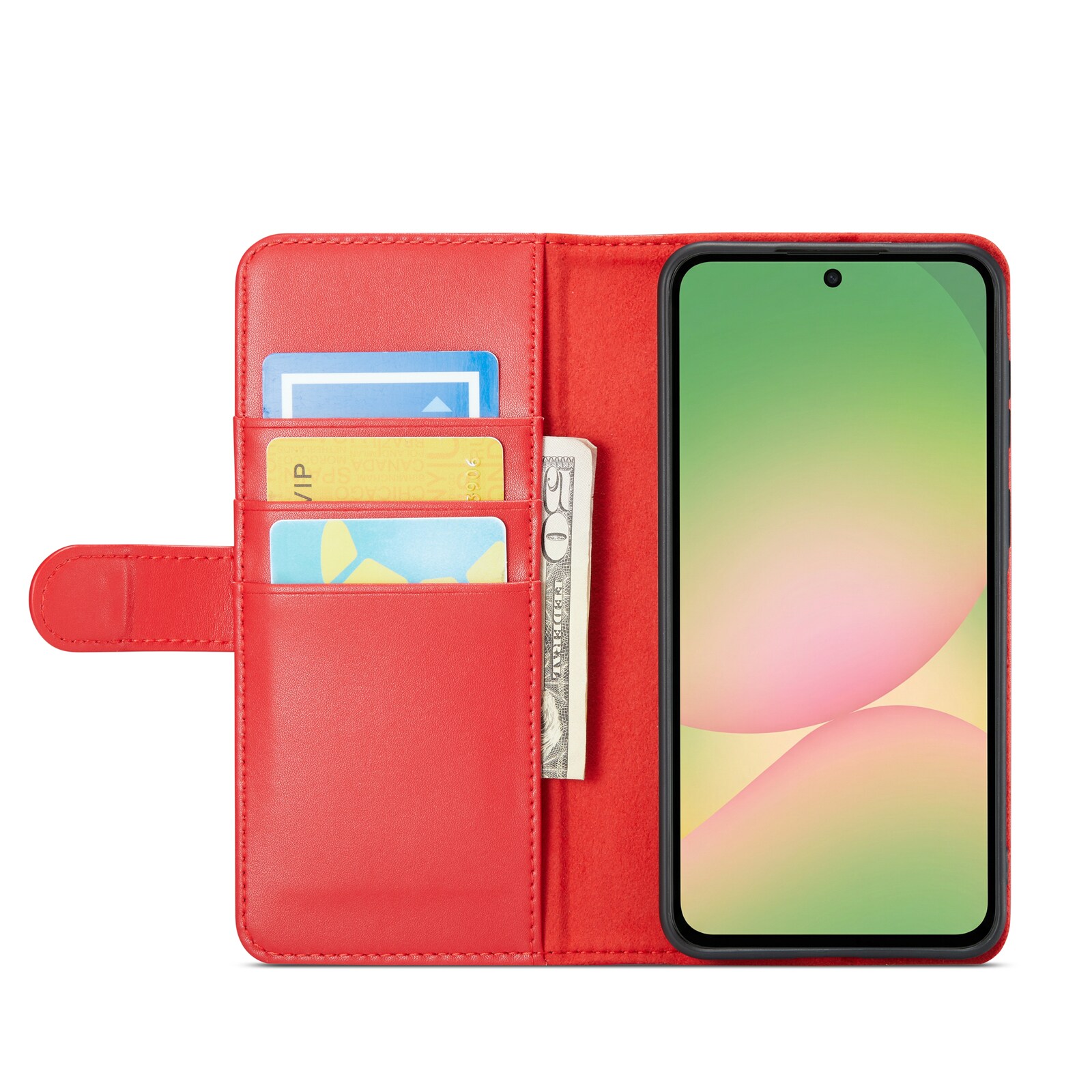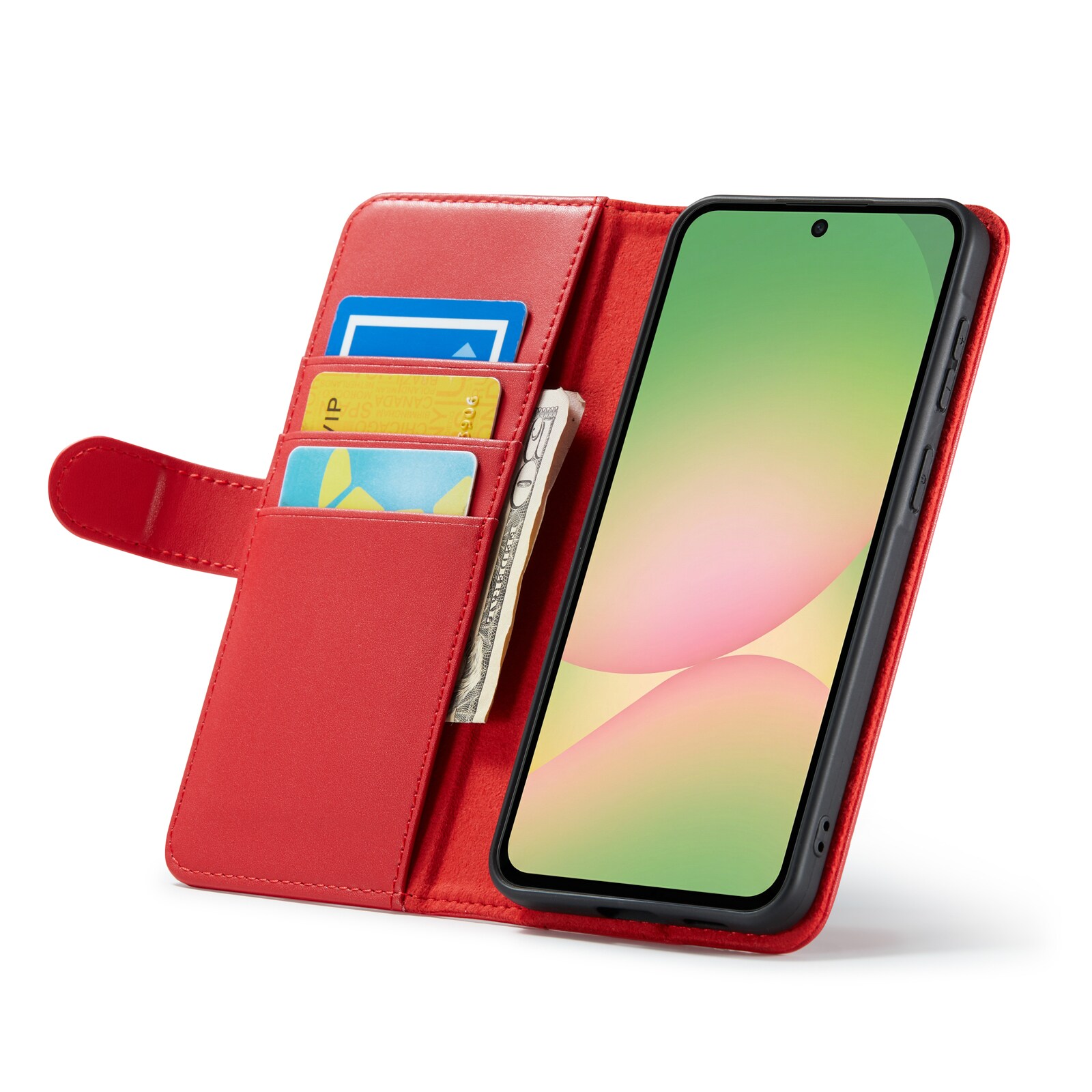 Mobilfodral i äkta läder till Samsung Galaxy A57 från Mobique. Fodralet skyddar runt hela din telefon och har en rymlig plånbok på insidan av locket. Plånboken är rymlig med tre kortfack och en sedelficka.