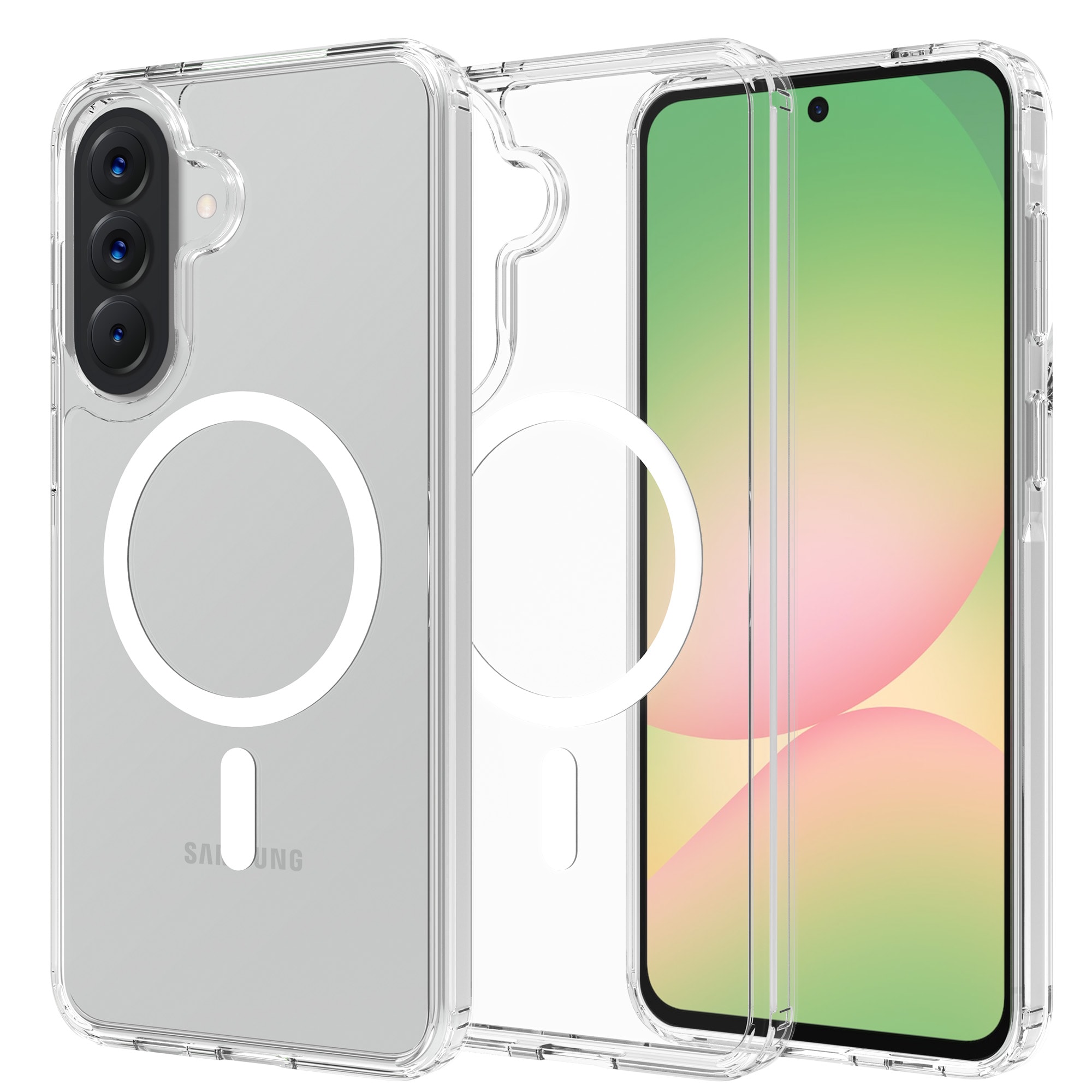Hybridskal med magnetisk ring till Samsung Galaxy A57. För bästa skydd mot stötar och fall är skalet tvådelat med en TPU-kärna och ett hölje i hårdplast. Ringen på baksidan är magnetisk och kan användas tllsammans med MagSafe-kompatibla tillbehör såsom laddare och korthållare.