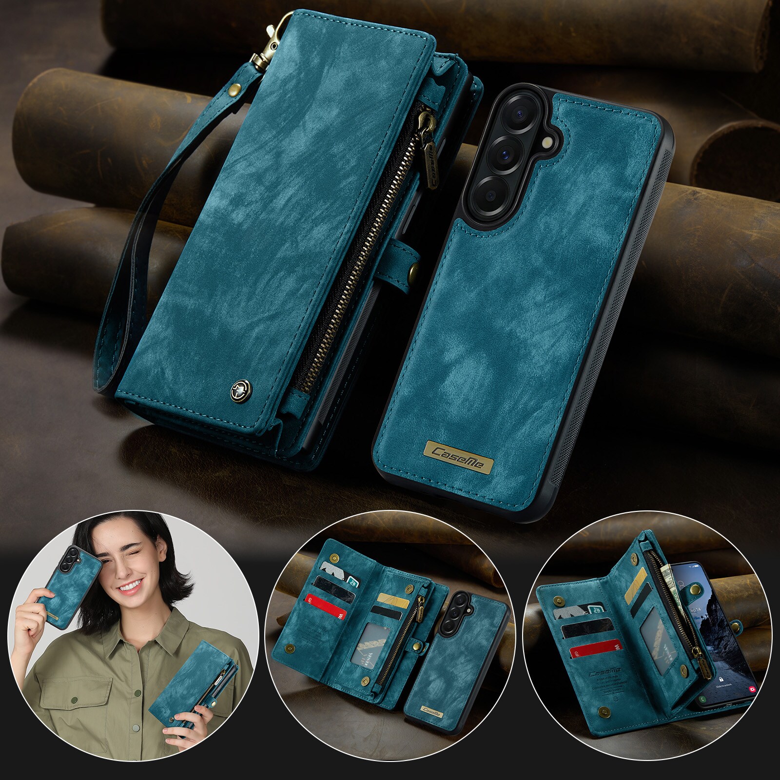 Mobilfodral med magnetskal och plånbok med extra många kortplatser till Samsung Galaxy A57 från CaseMe. Den rymliga plånboken har sedelficka, myntfack med dragkedja och ett flertal kortfack.