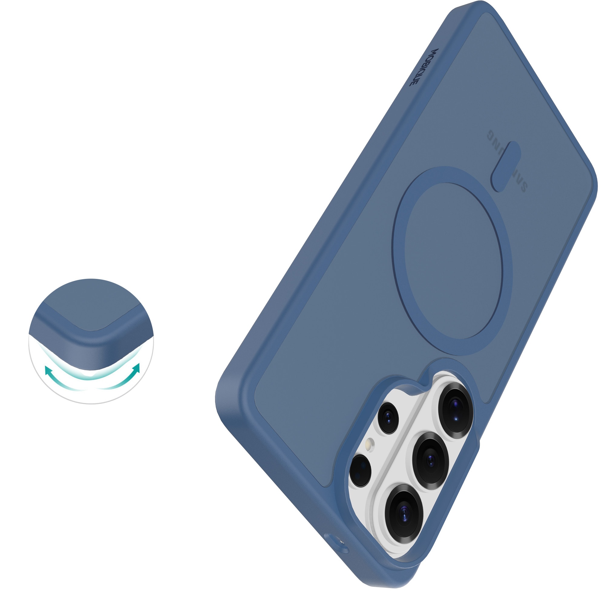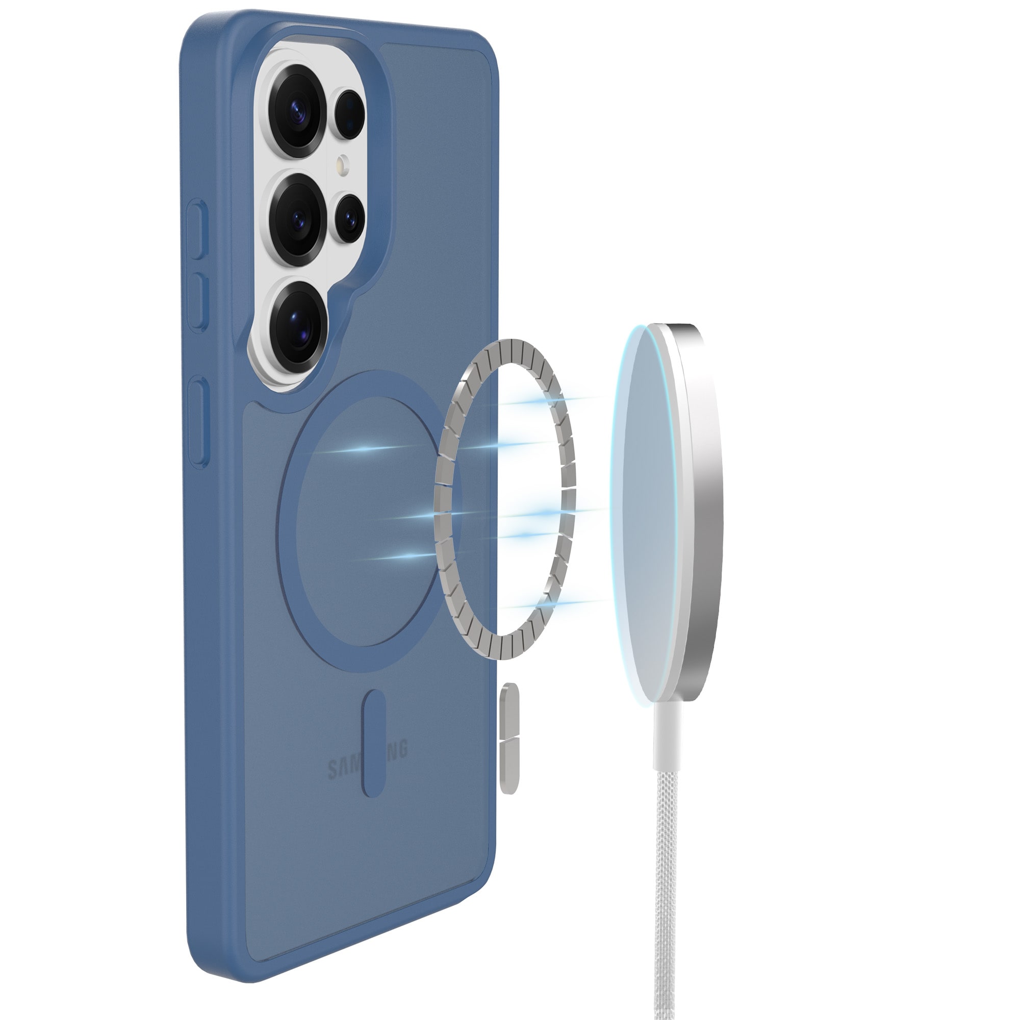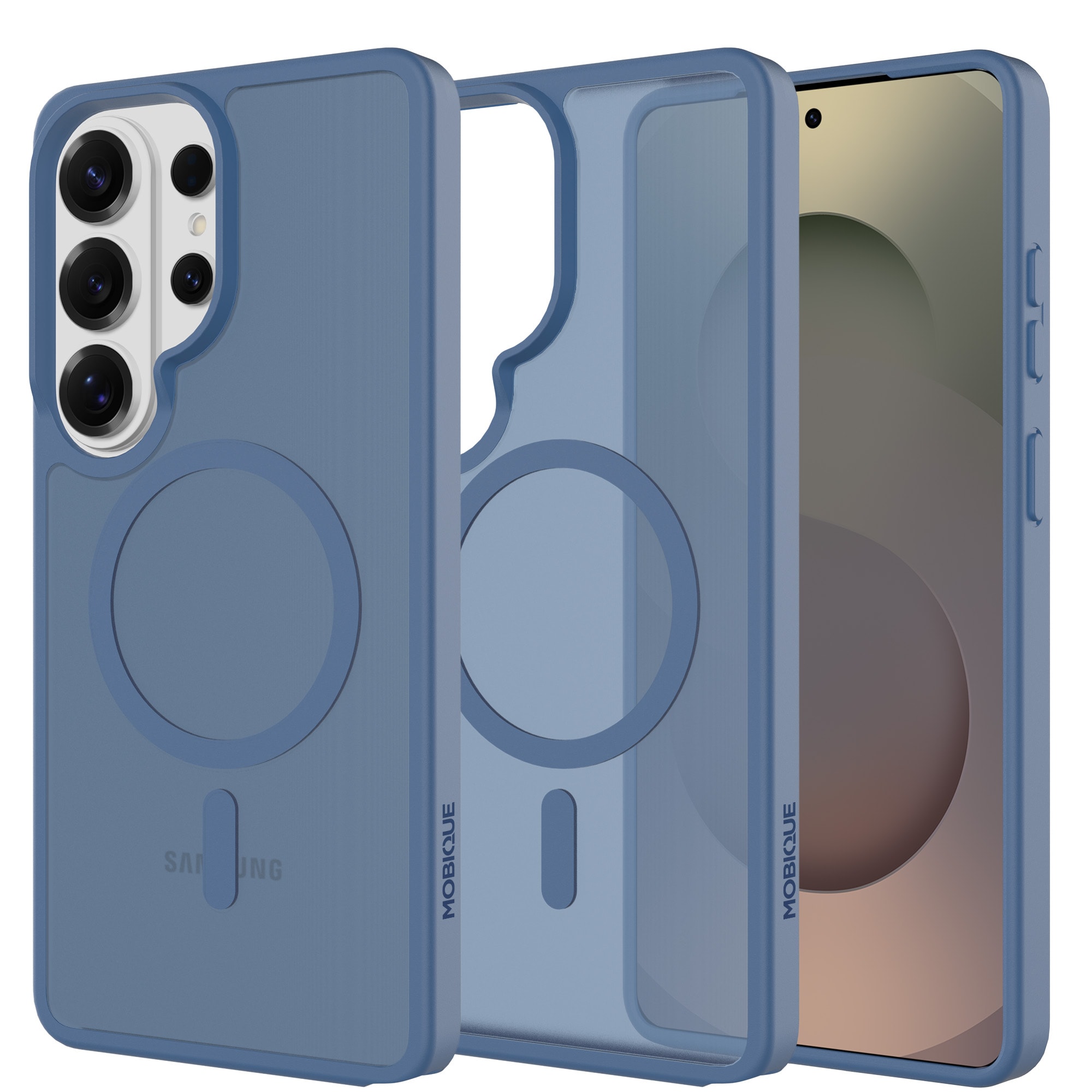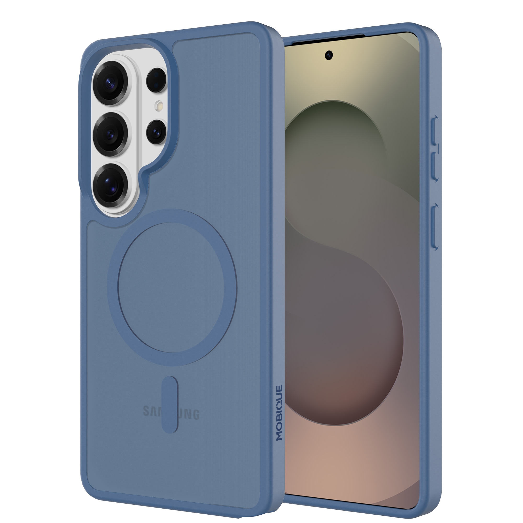 Hybridskal med magnetisk ring för Samsung Galaxy S26 Ultra från Mobique. Skalet har en stilren frostad finish och är utrustat med en magnetisk ring på baksidan. Ringen gör det enkelt att använda skalet tillsammans med MagSafe-kompatibla tillbehör, som laddare och korthållare.