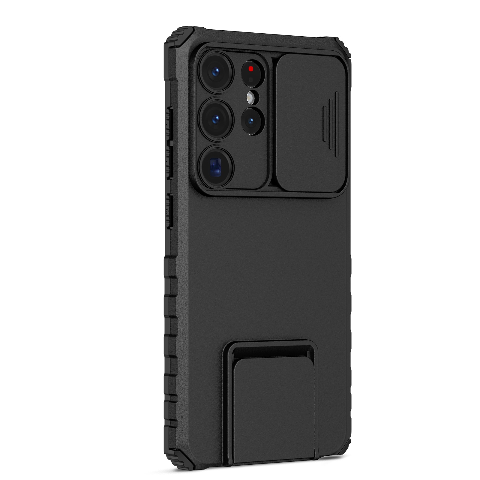 Robust skal till Samsung Galaxy S26 Ultra med inbyggt kameraskydd och stativ. Skalet har en tvålagerskonstruktion som består av en ram i flexibel TPU och ett yttre hölje i hårdplast. Kanterna är förstärka för att skalet effektivt ska dämpa vid fall och stötar.