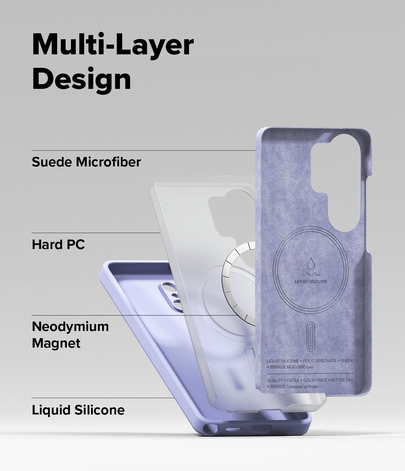 Stilrent silikonskal med MagSafe från Ringke till Samsung Galaxy S26 Ultra. Skalet är stötdämpande för att skydda mot skador och MagSafe-stödet gör att du kan använda MagSafe-tillbehör och MagSafe-ladda med skalet på.