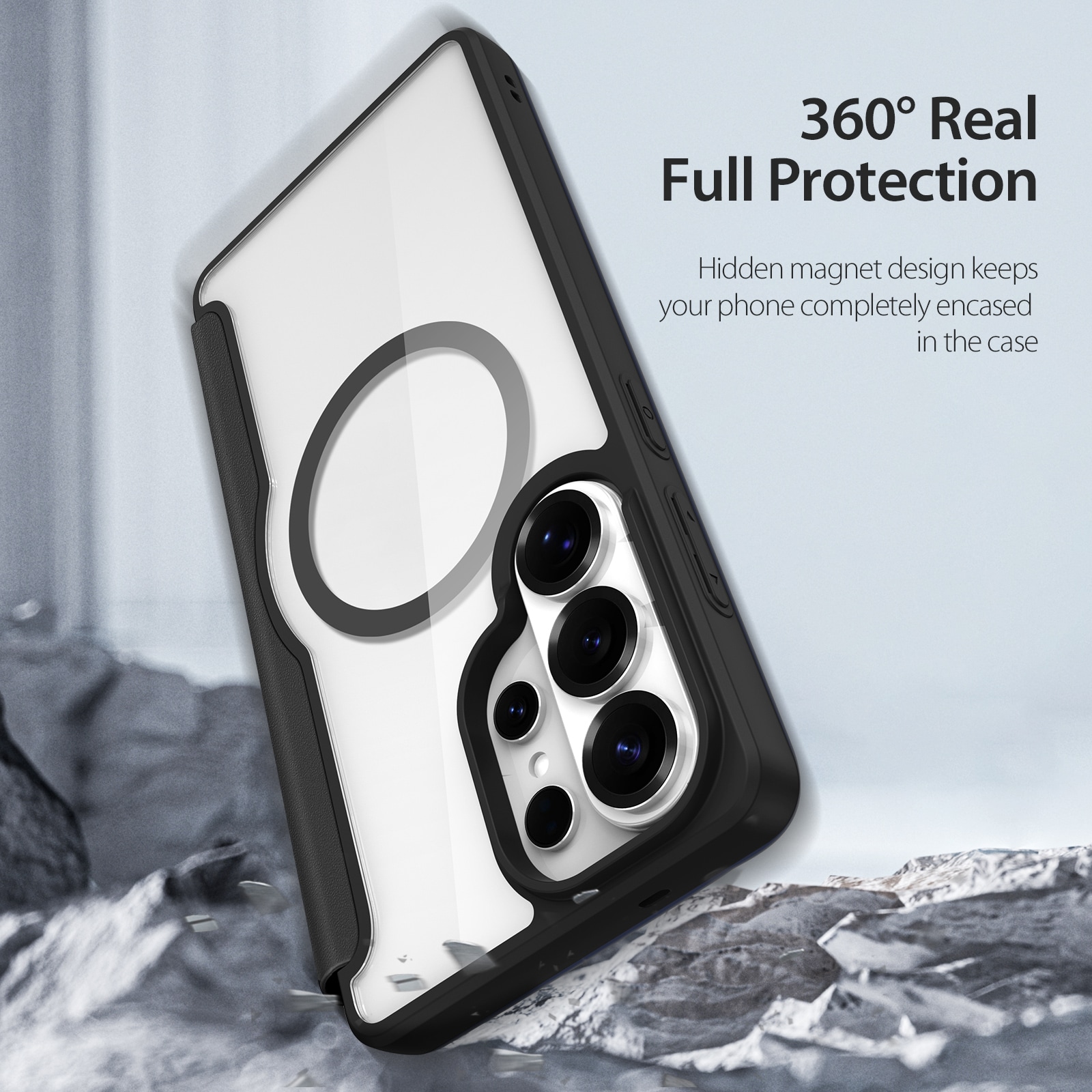 Tunt fodral med kortfack kompatibelt med MagSafe från Dux Ducis till Samsung Galaxy S26 Ultra. Trots sin slimmade och lätta design skyddar det här fodralet runt om hela telefonen. Telefonen sitter säkert fast i det stötdämpande innerskalet, tillverkat av hårdplast med en ram av TPU.