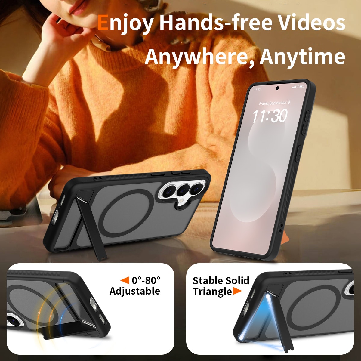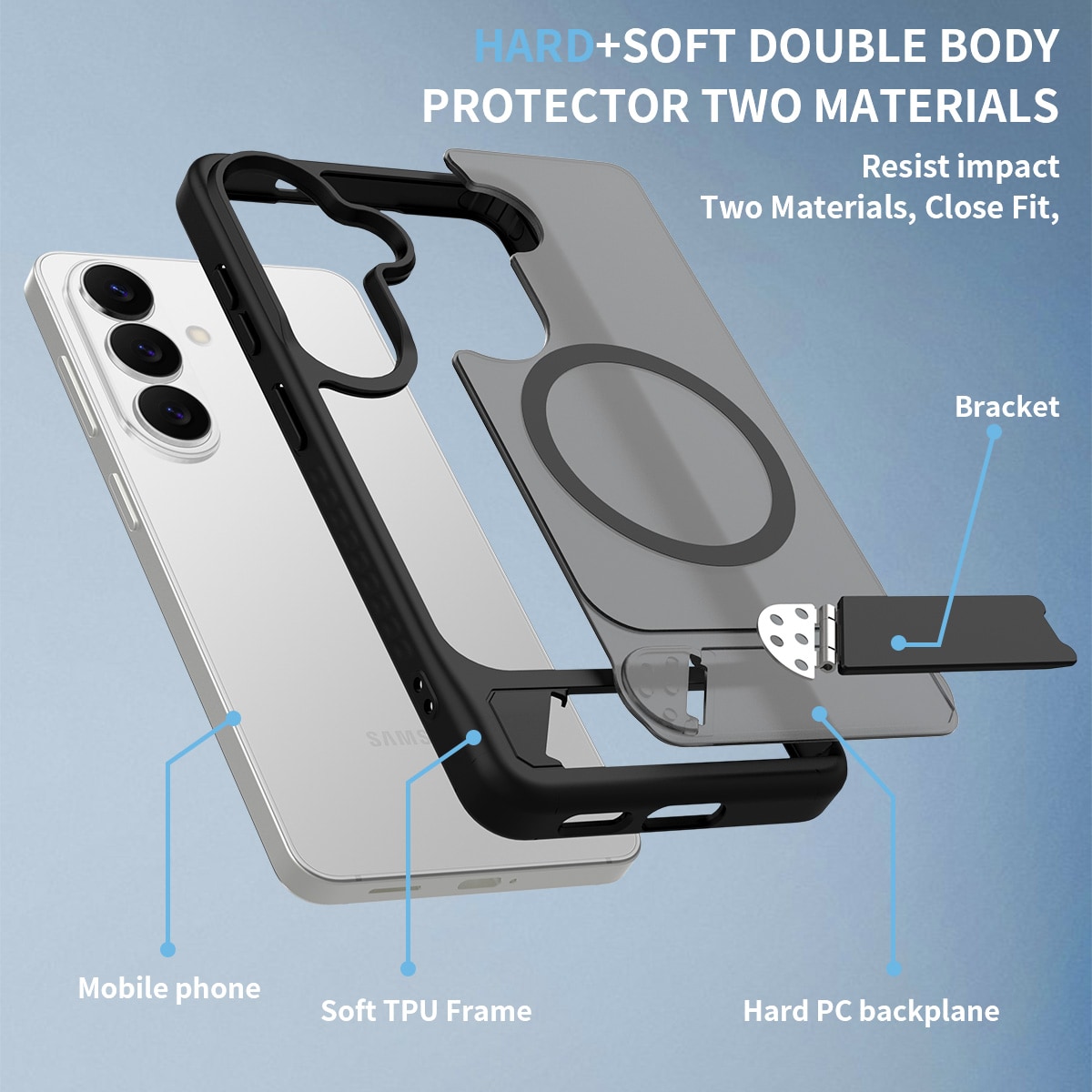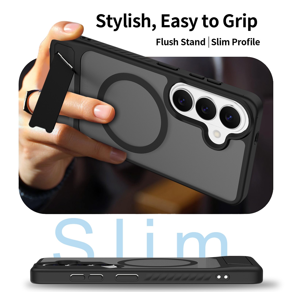 Snyggt och praktiskt hybridskal med inbyggt ställ för Samsung Galaxy S26. Skalet skyddar din telefon mot stötar och repor med en slitstark kombination av hårdplast och flexibel TPU. Det utfällbara stället gör det enkelt att titta på film, klipp eller spela handsfree.