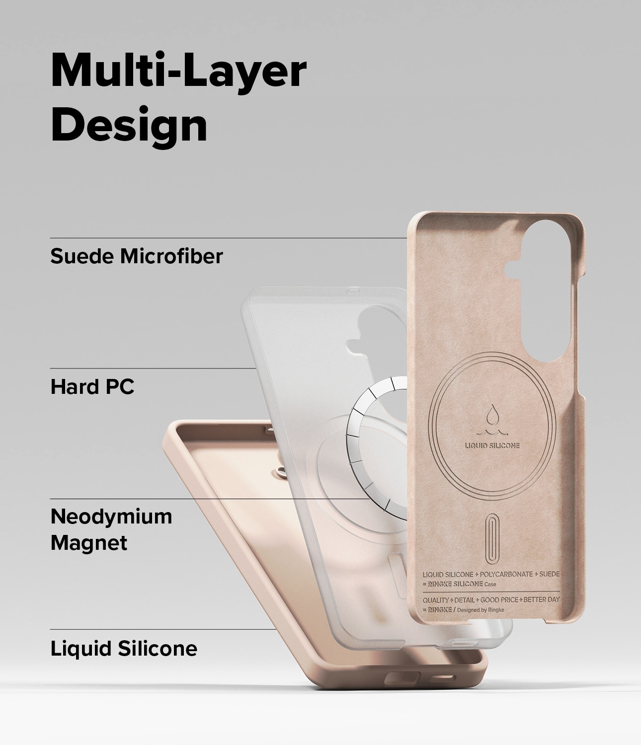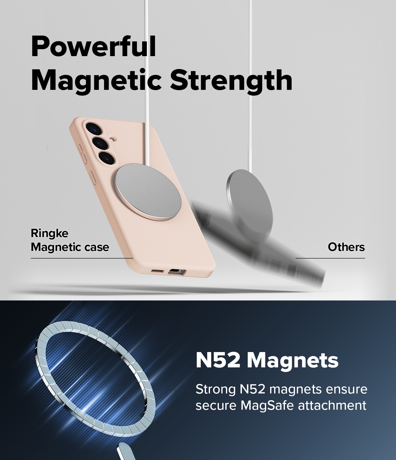 Stilrent silikonskal med MagSafe från Ringke till Samsung Galaxy S26. Skalet är stötdämpande för att skydda mot skador och MagSafe-stödet gör att du kan använda MagSafe-tillbehör och MagSafe-ladda med skalet på.