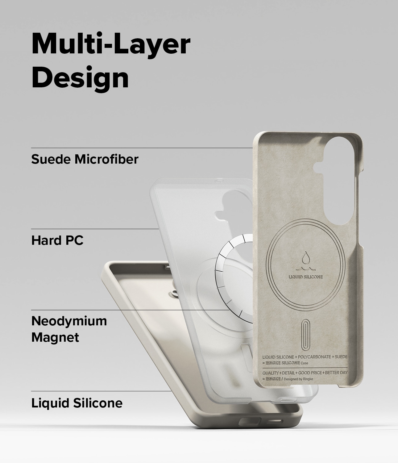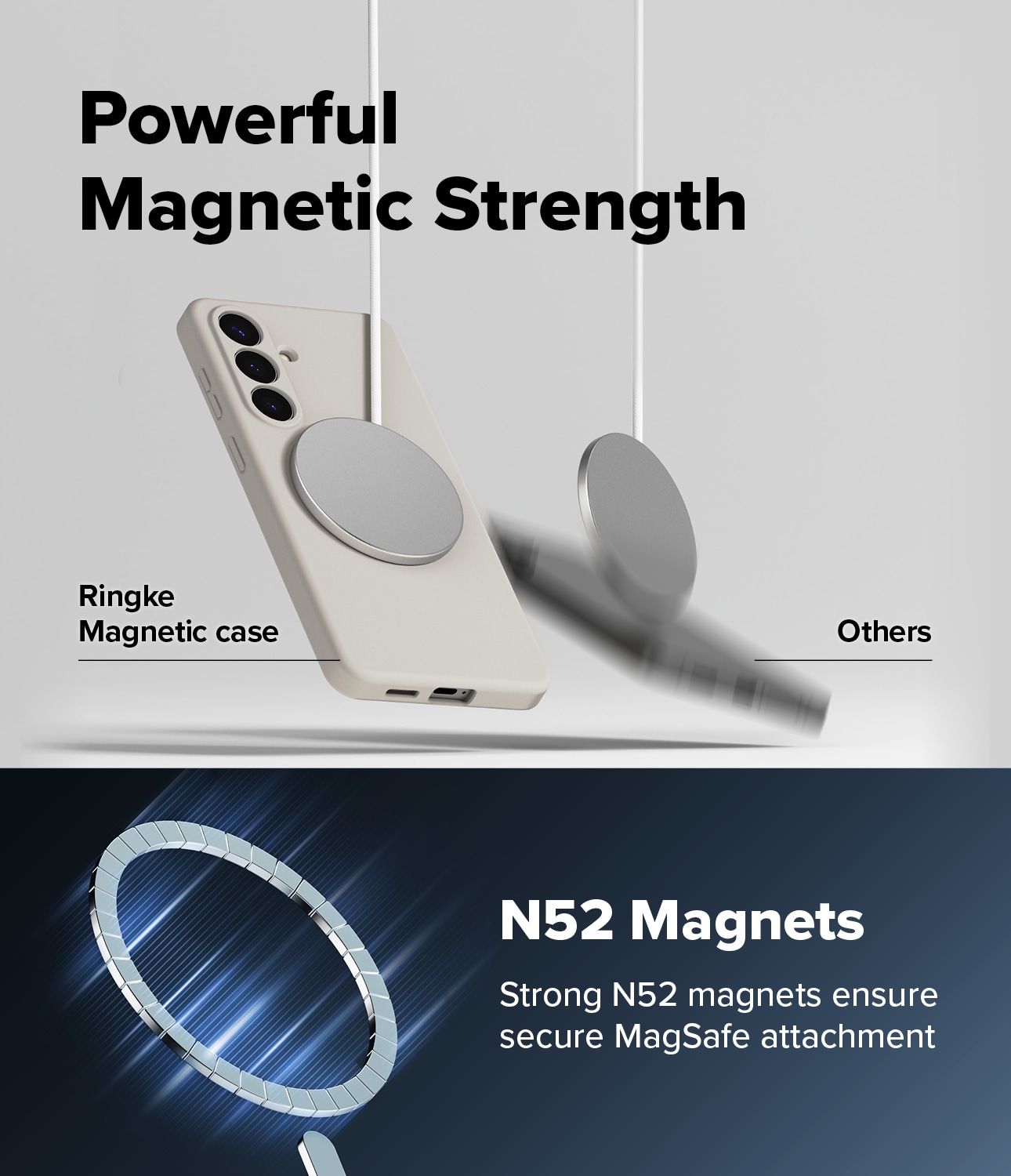 Stilrent silikonskal med MagSafe från Ringke till Samsung Galaxy S26. Skalet är stötdämpande för att skydda mot skador och MagSafe-stödet gör att du kan använda MagSafe-tillbehör och MagSafe-ladda med skalet på.