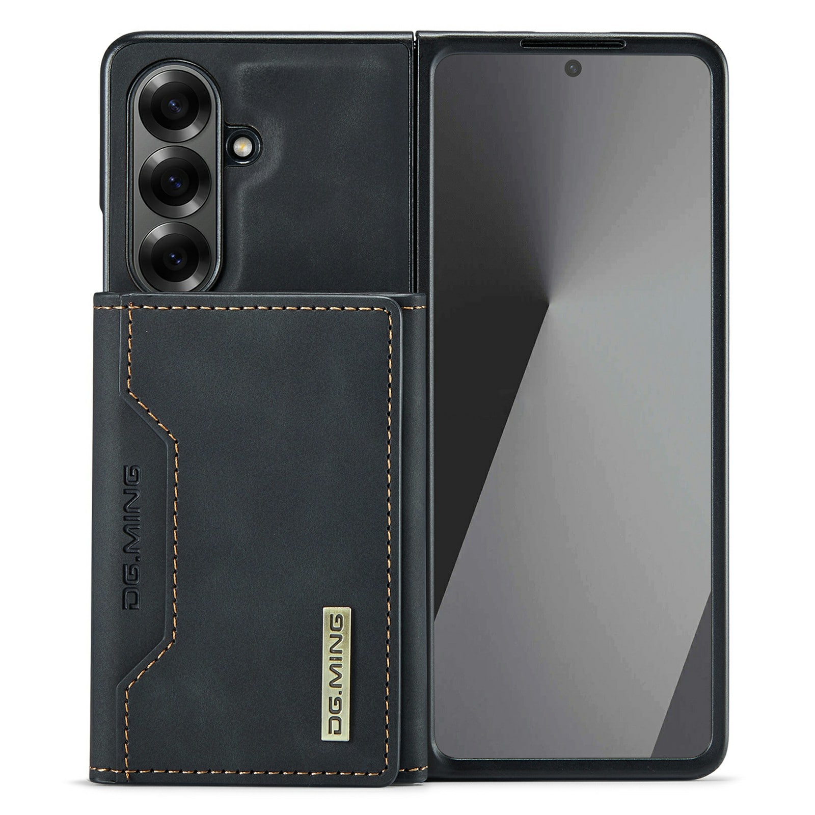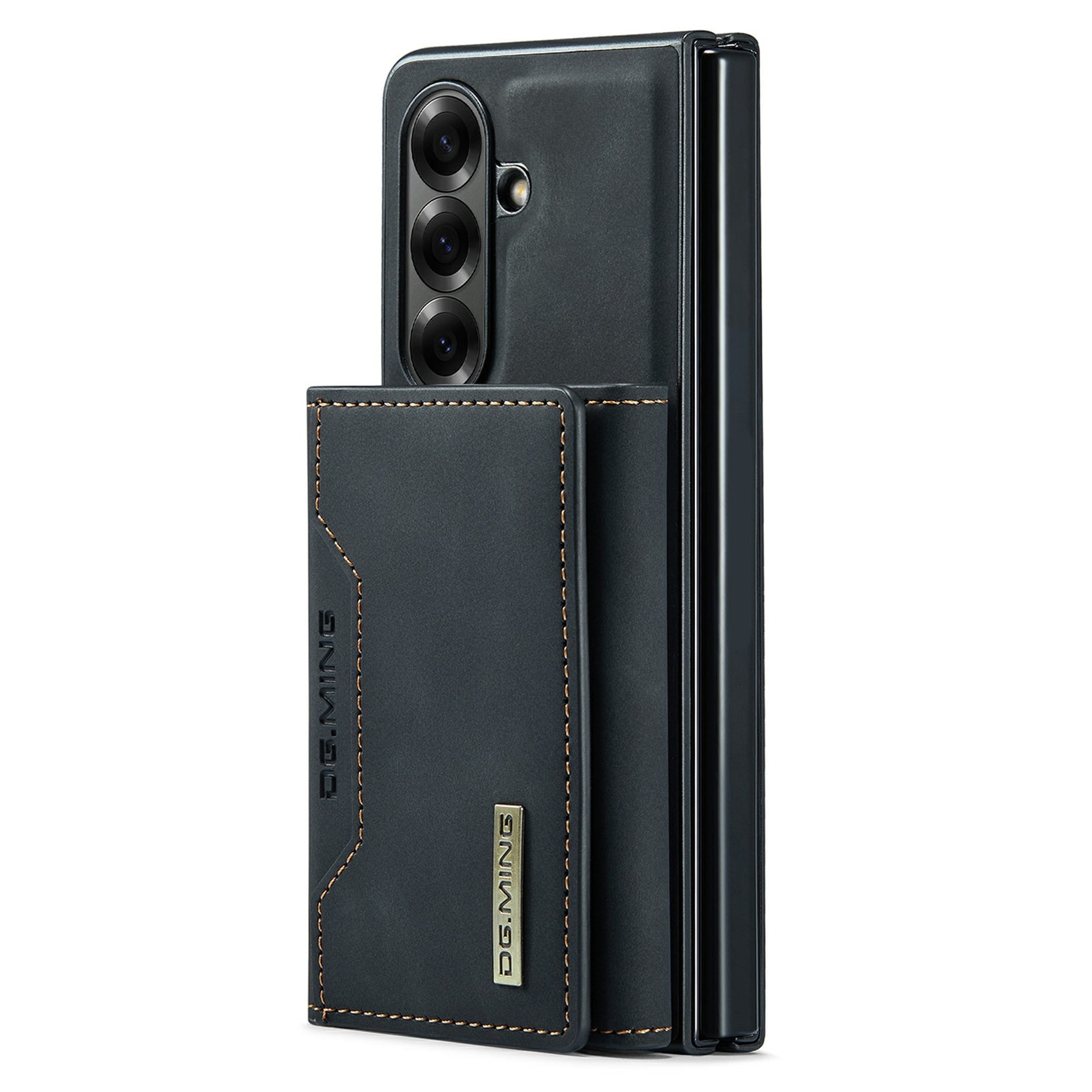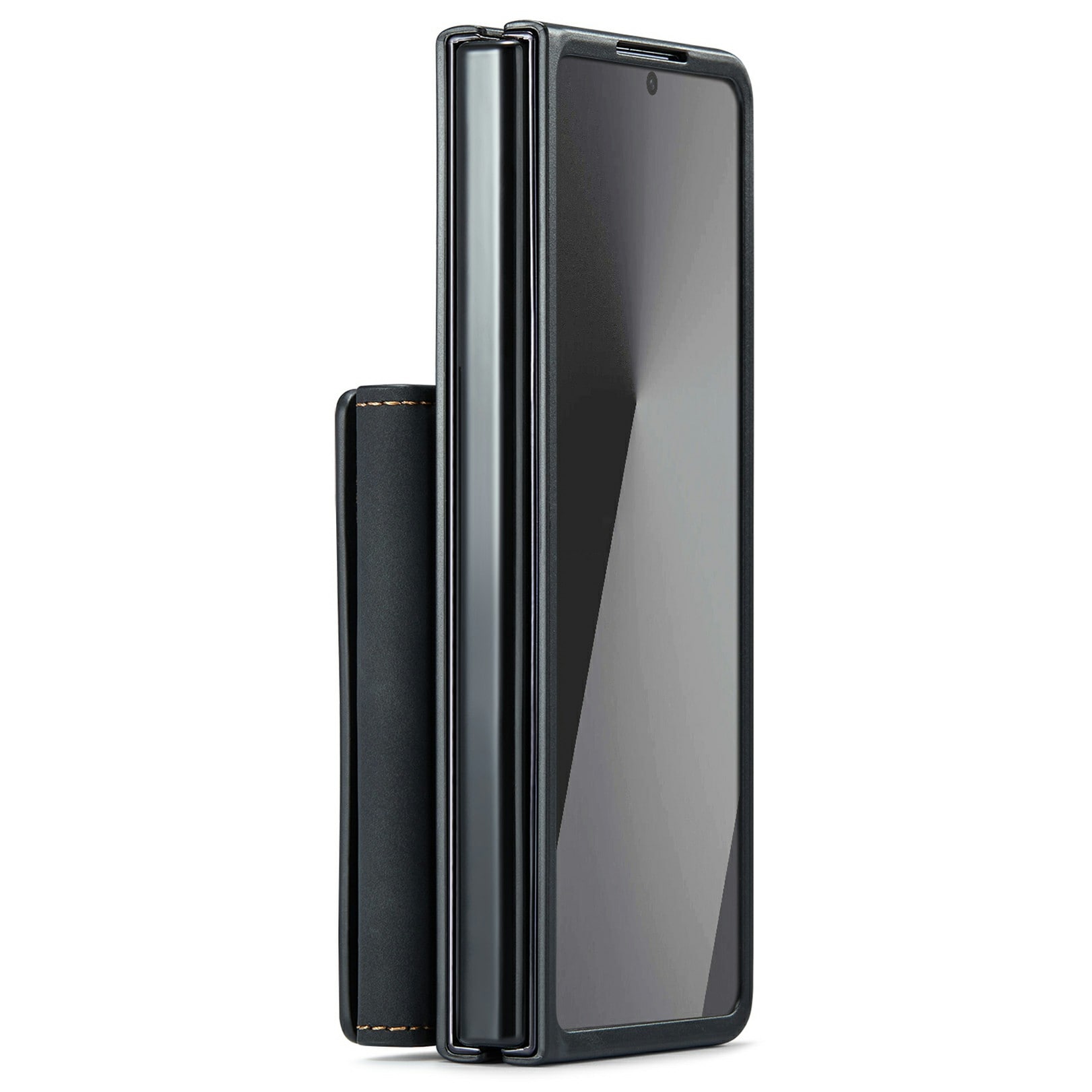 Läderskal till Samsung Galaxy Z Fold 7 med tillhörande plånbok. Plånboken fästs med magneter på baksidan av skalet och kan enkelt plockas av när man inte behöver den. Genom att fälla ut plånboken så kan den även fungera som stativ så att du smidigt kan kolla på film eller videoklipp.