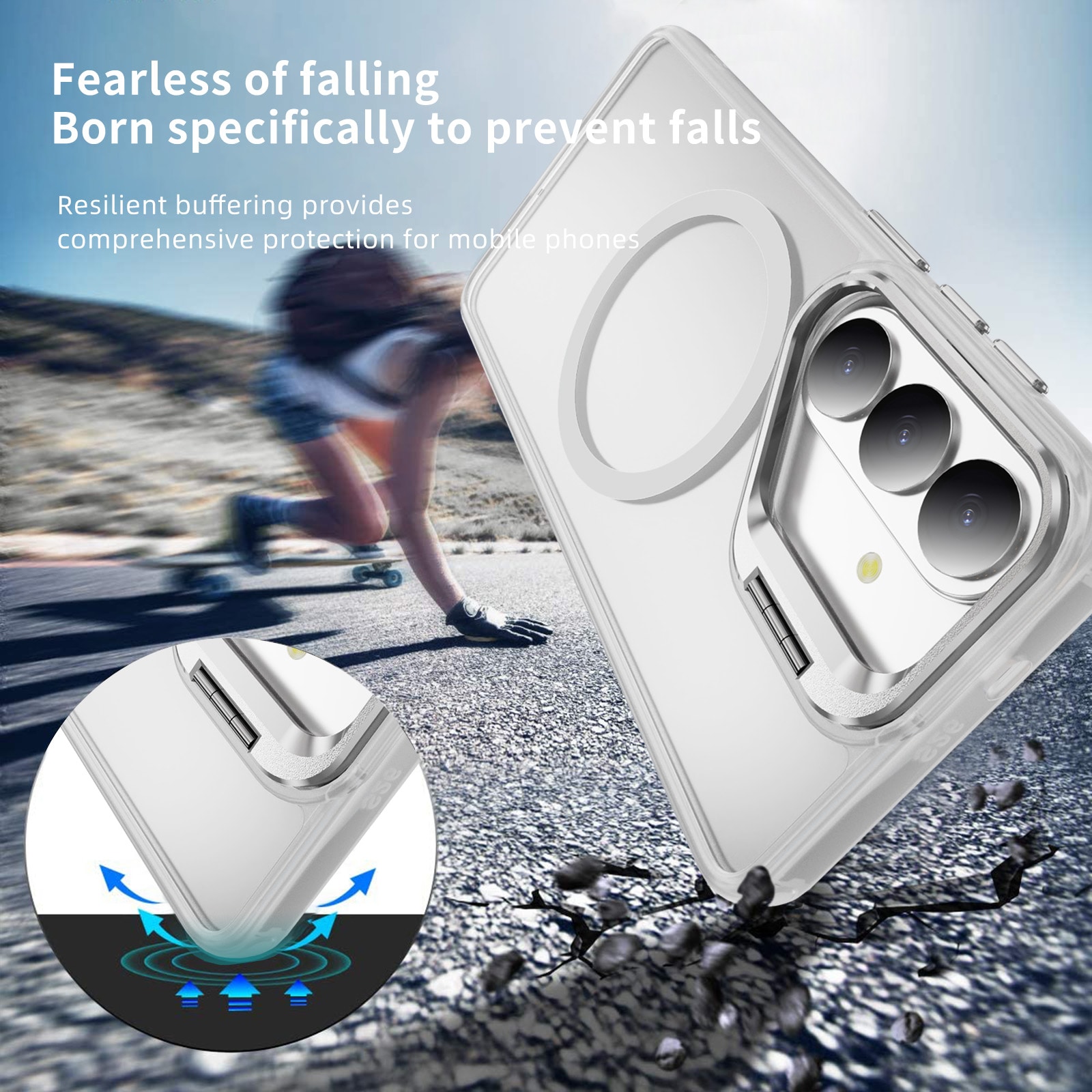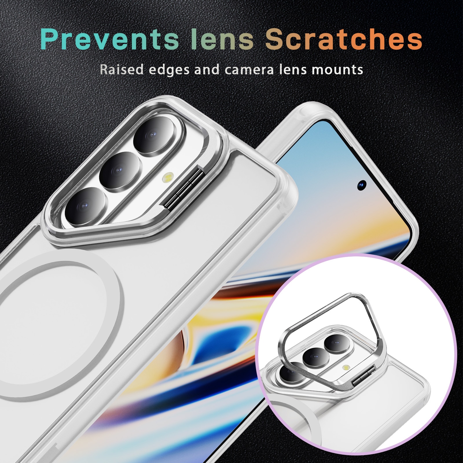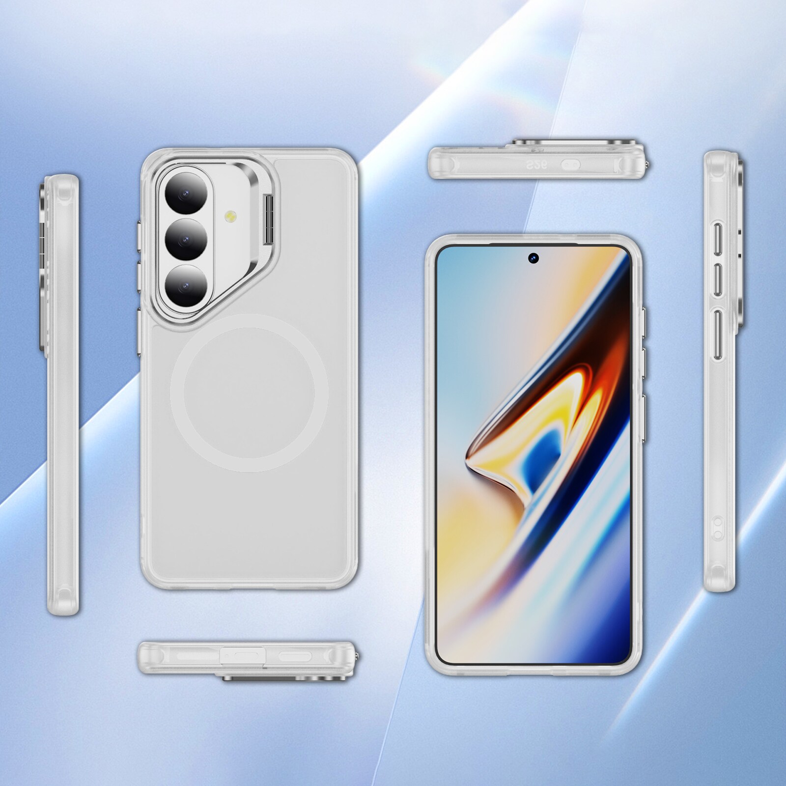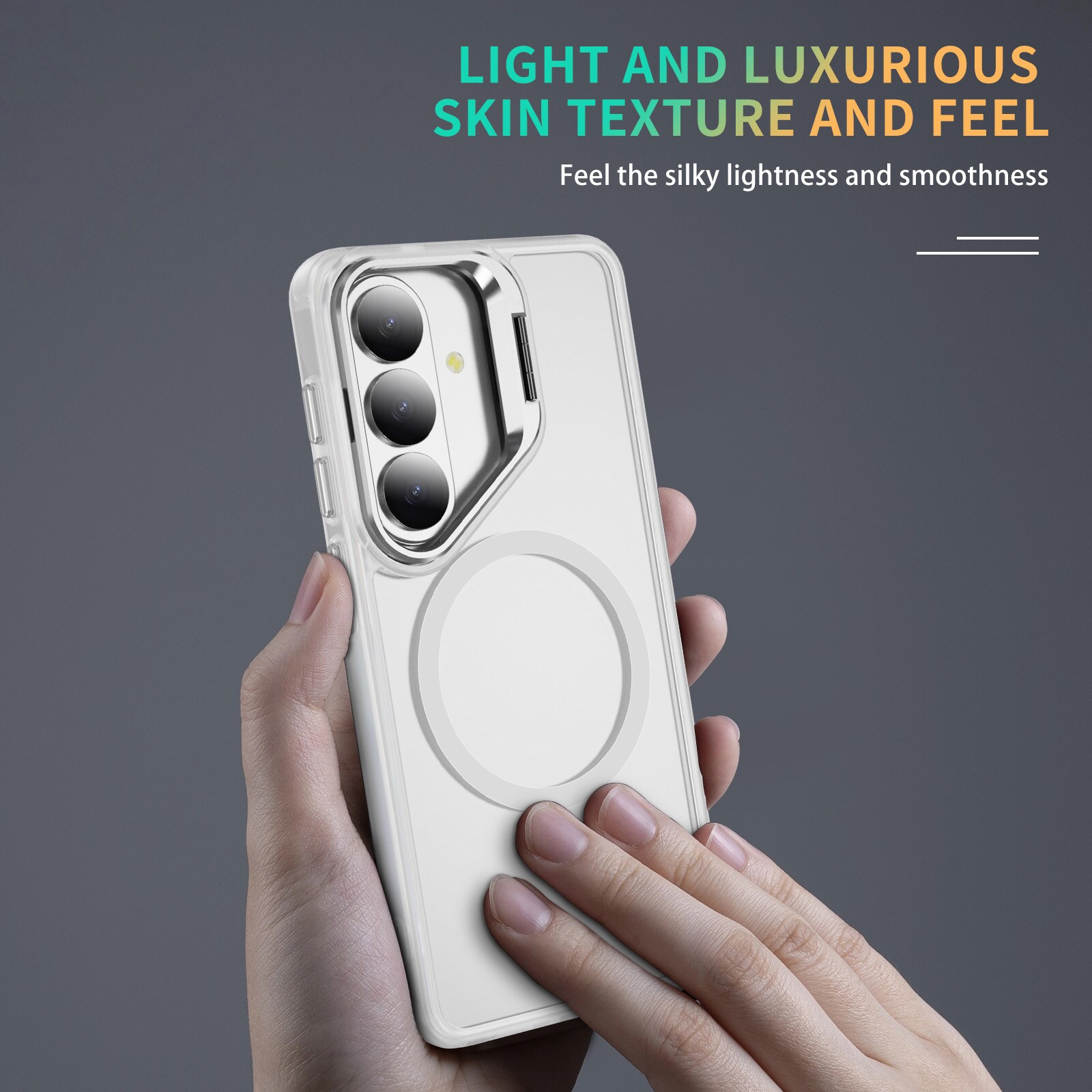 Snyggt och praktiskt hybridskal med utfällbart kickstand och MagSafe till Samsung Galaxy S26. För bästa skydd mot stötar och fall är skalet tvådelat med en TPU-kärna och ett hölje i hårdplast. Skalet har en metallram runt kameran som förhindrar skador på kameralinserna och fungerar även som ett praktiskt, utfällbart stativ för filmvisning, videoklipp eller spel med bekväm visningsvinkel.