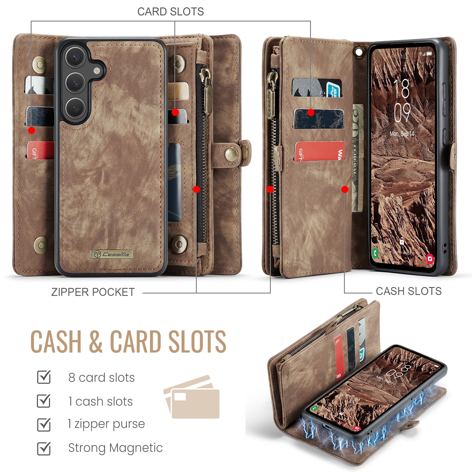 Mobilfodral med magnetskal och plånbok med extra många kortplatser till Samsung Galaxy S26 från CaseMe. Den rymliga plånboken har sedelficka, myntfack med dragkedja och ett flertal kortfack.