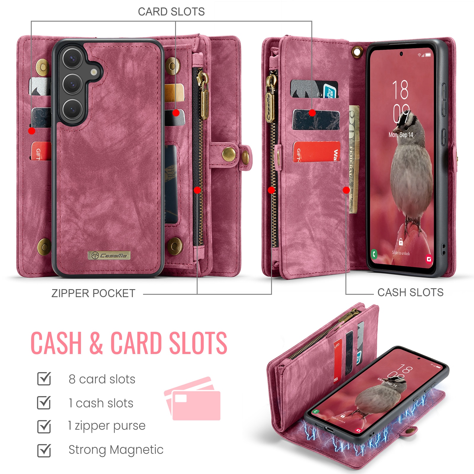 Mobilfodral med magnetskal och plånbok med extra många kortplatser till Samsung Galaxy S26 Plus från CaseMe. Den rymliga plånboken har sedelficka, myntfack med dragkedja och ett flertal kortfack.