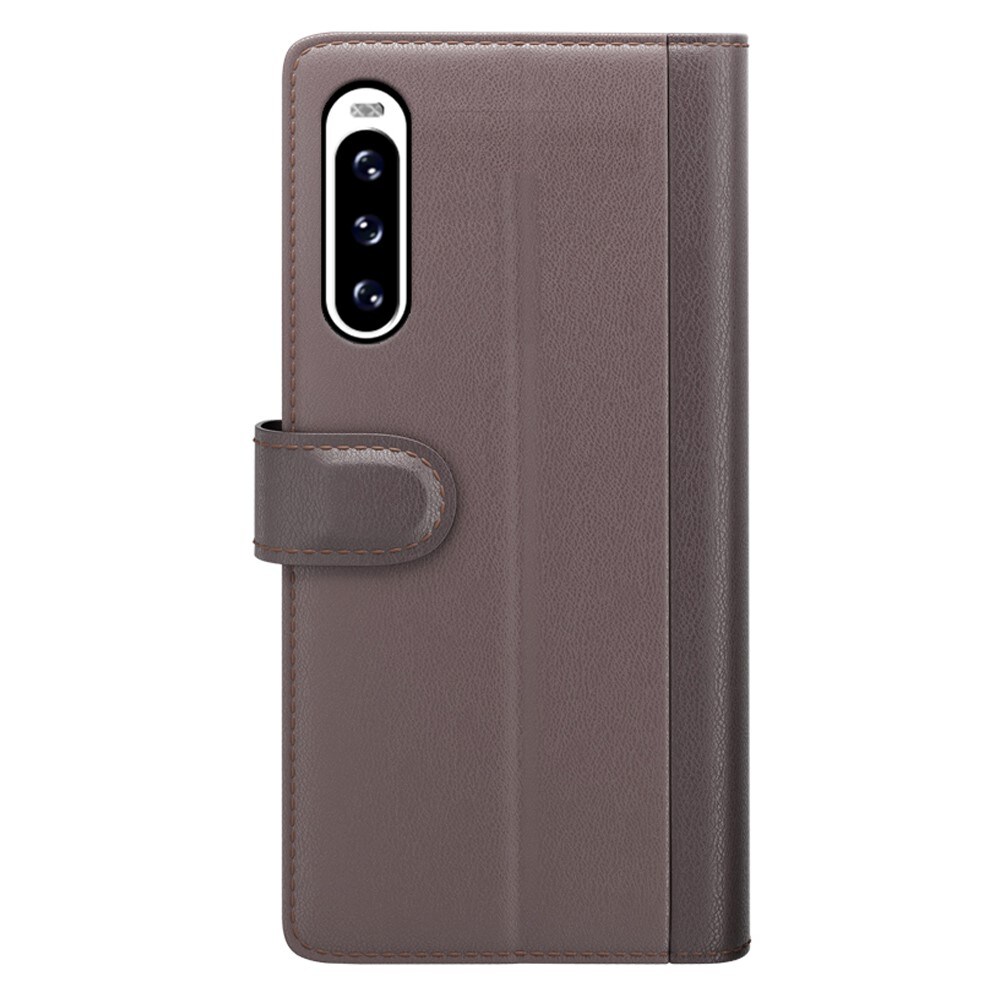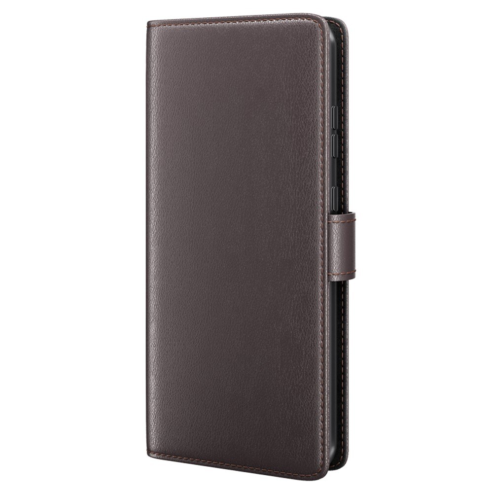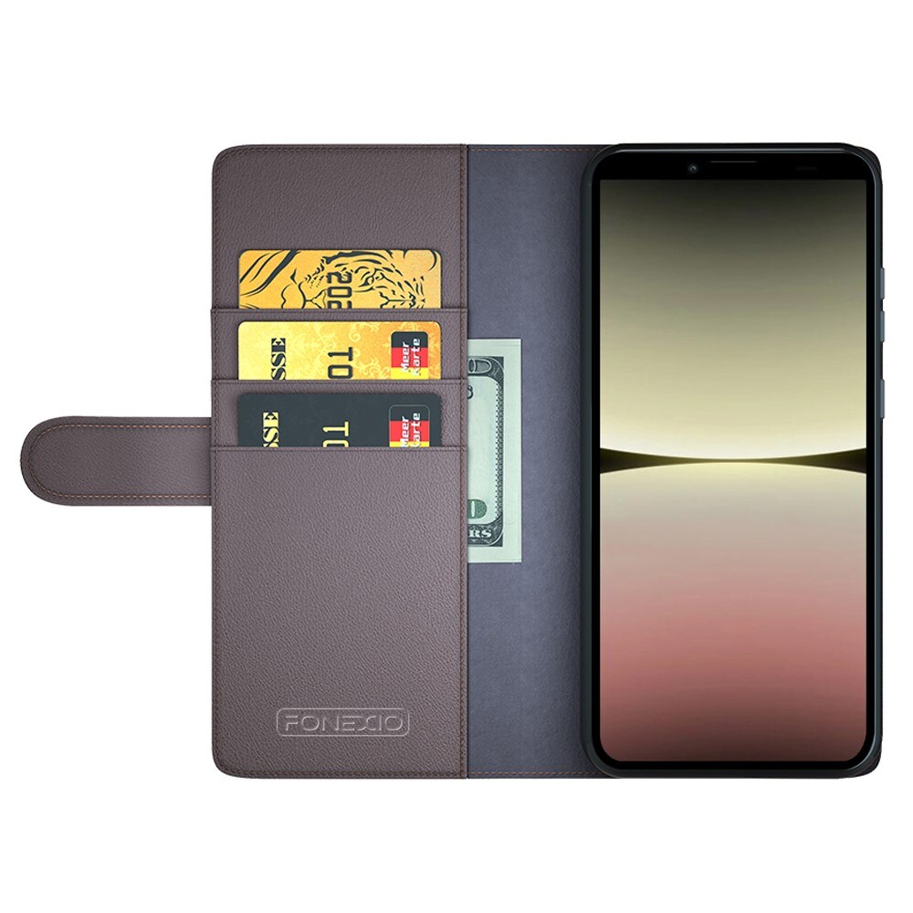 Mobilfodral i äkta läder till Sony Xperia 10 V. Fodralet skyddar runt hela din telefon och har en rymlig plånbok på insidan av locket. Plånboken är rymlig med tre kortfack och en sedelficka.