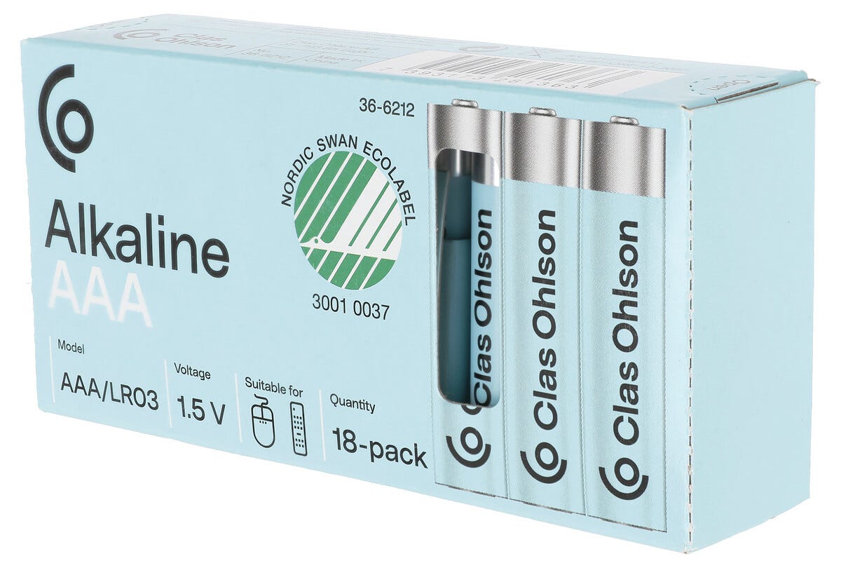 62209Alkaliskt AAA-batteri LR03 (18-pack)https://www.phonelife.se/ovriga-tillbehor/batterier/aaa/alkaliskt-aaa-batteri-lr03-18-pack?channelCountry=SEhttps://www.phonelife.se/pub_images/original/68762856718366.jpgInStock69SEK/ovriga-tillbehor/batterier/aaaClas Ohlson<p>Alkaliska AAA batterier LR03 är ett praktiskt val för användning i de flesta batteridrivna apparater i hemmet. Batterierna passar till exempel fjärrkontroller, mindre leksaker, ficklampor och andra elektroniska tillbehör som kräver stabil strömförsörjning. De levereras i en smart och lättöppnad förpackning som gör det enkelt att hantera batterierna och samtidigt ger möjlighet att förvara förbrukade batterier på ett organiserat sätt. Batterierna är Svanenmärkta vilket gör dem till ett mer miljöanpassat alternativ vid engångsanvändning.</p> <p>- Alkaliska batterier för vardaglig elektronik<br /> - Passar många batteridrivna apparater<br /> - Svanenmärkt alternativ<br /> - Smart och lättöppnad förpackning<br /> - Förvaring för förbrukade batterier<br /> <br /> - Batterityp: AAA LR03<br /> - Antal Batterier: 18 st<br /> - Batteriteknik: Alkaliskt</p>69BatteriÅter 2026-03-25