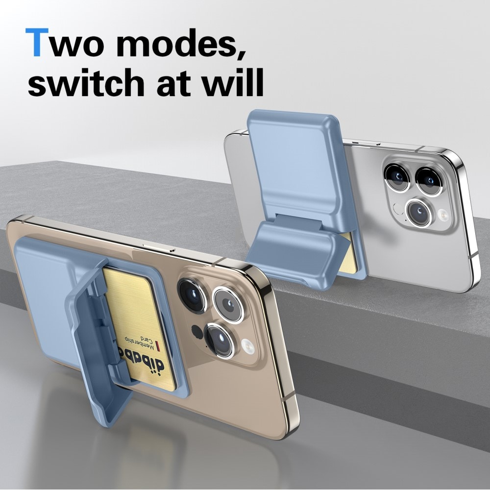 Magnetisk korthållare med inbyggt ställ som är MagSafe-komptaibelt och som fästs på baksidan av telefonen. Korthållaren är tillverkad av slitstark polykarbonat för att tåla det mesta, samtidigt som den låter dig förvara upp till tre stycken kort. Korthållaren har även ett inbyggt stativ som du enkelt fäller ut för att ställa upp telefonen och njuta av handsfree-visning.
