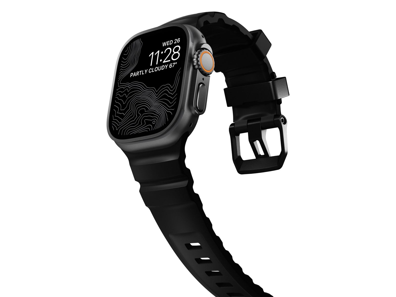 Robust och stilfullt armband till Apple Watch Ultra 49mm 3rd Gen från Nomad. Armbandet är utmärkt att bära såväl till vardags som till träning då det är tillverkat av slitstarkt och flexibelt gummi som andas väl. Den lena finishen och luftiga designen gör att det ligger bekvämt mot handleden.