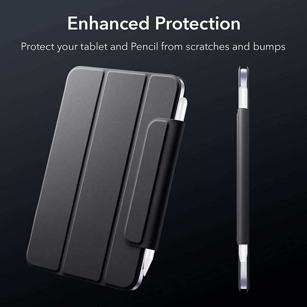 Magnetiskt fodral från ESR perfekt utformat för Apple iPad Mini 6 från 2021. Du fäster fodralet på surfplattan endast med magneter, vilket inte gör surfplattan klumpig. Du kan även enkelt sätta på och ta av fodralet vid behov. Fodralet skyddar runt om hela surfplattan och har ett smart lock som kan vikas till ett ställ i två vinklar. Din Apple Pencil förvarar och laddar du säkert under magnetlåset som håller locket stängt.