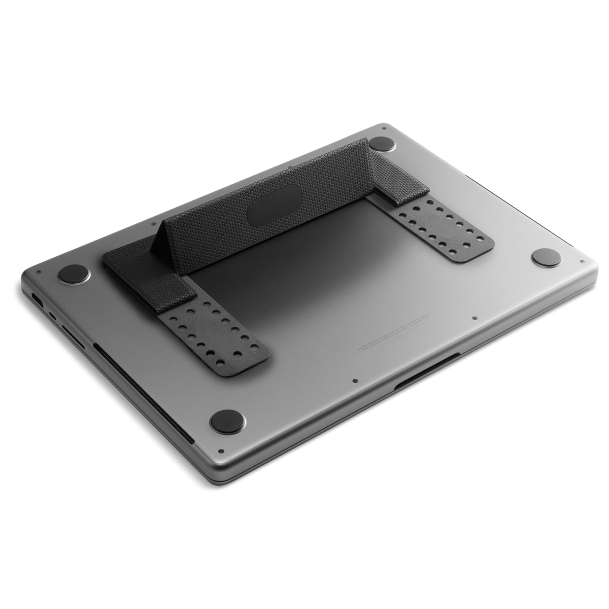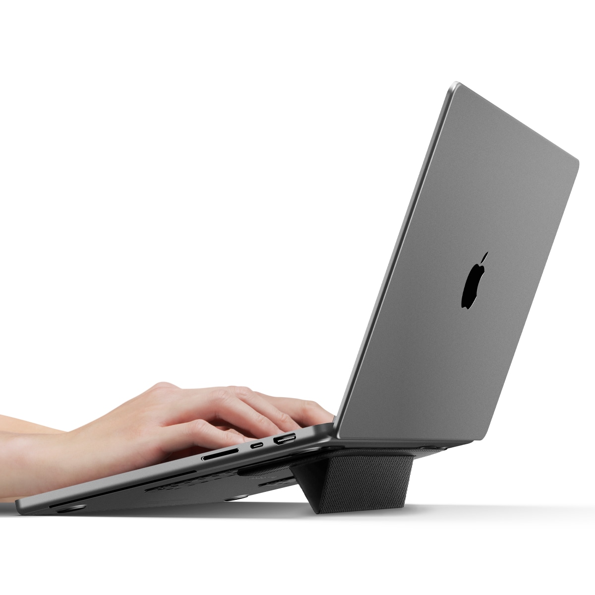 Stället fästs med en stark, återanvändbar självhäftande yta som sitter stabilt utan att lämna märken. Med två justerbara vinklar kan du förbättra skrivställningen och hållningen, samtidigt som luftflödet under datorn ökar. Den strukturerade PU-ytan ser till att datorn står stadigt.