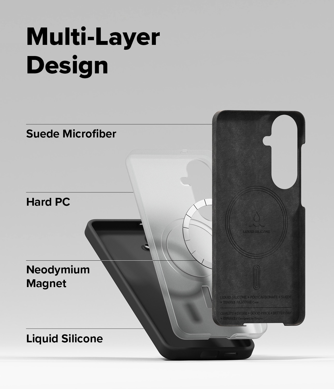 Stilrent silikonskal med MagSafe från Ringke till Samsung Galaxy S26 Plus. Skalet är stötdämpande för att skydda mot skador och MagSafe-stödet gör att du kan använda MagSafe-tillbehör och MagSafe-ladda med skalet på.