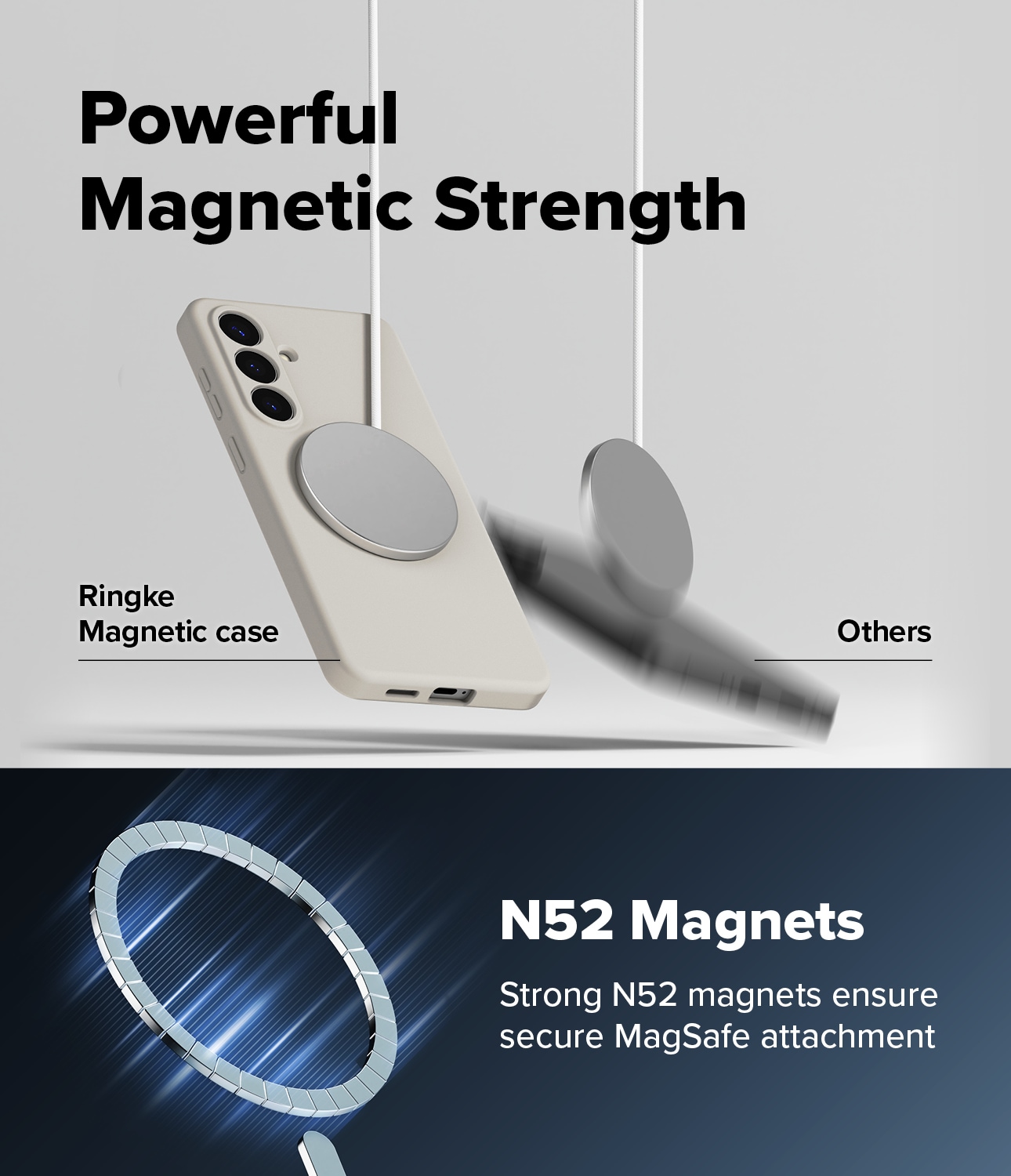 Stilrent silikonskal med MagSafe från Ringke till Samsung Galaxy S26 Plus. Skalet är stötdämpande för att skydda mot skador och MagSafe-stödet gör att du kan använda MagSafe-tillbehör och MagSafe-ladda med skalet på.