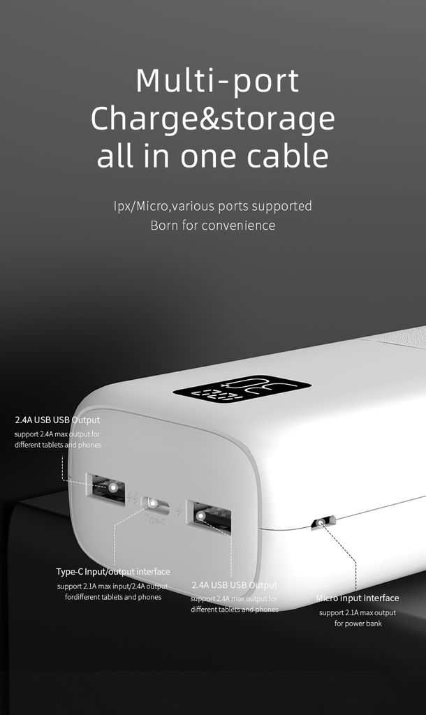 <p>Powerbanken är utrustad med en USB-C-port och två USB-A-portar, vilket ger dig flexibilitet att ladda flera enheter samtidigt. USB-A-portarna stöder upp till 2.4A för snabb och effektiv laddning av din mobiltelefon eller surfplatta. Powerbanken kan dessutom laddas via både USB-C och Micro-USB, vilket gör den enkel och smidig att använda oavsett vilken kabel du har tillgänglig.</p>