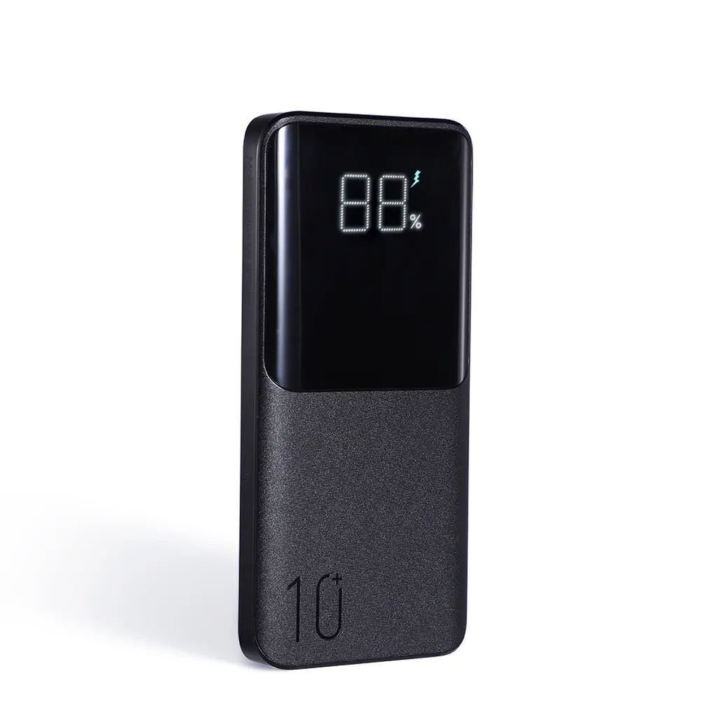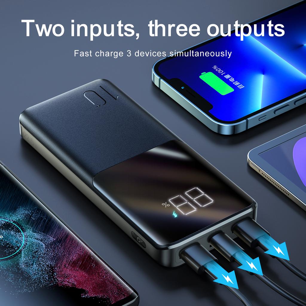 Powerbanken har en USB-C-port och två USB-A-portar, vilket gör att du kan ladda upp till tre enheter samtidigt. Den stöder snabbladdning upp till 22.5W och är kompatibel med flera snabbladdningsprotokoll som PD 3.0 och QC 3.0. Den tydliga LED-displayen visar batterinivån i procent, så du alltid har koll.