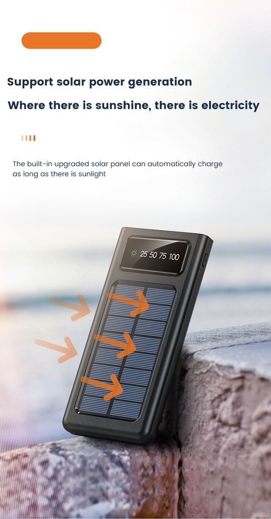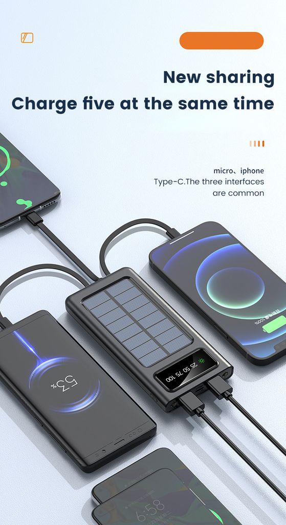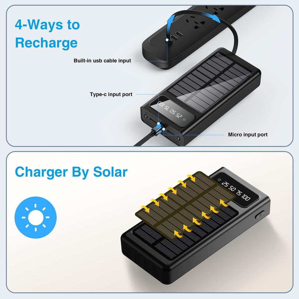 Powerbanken kan laddas via USB-C, Micro-USB eller integrerade solcellspaneler, vilket ger flexibel användning även när eluttag saknas. De inbyggda kablarna - USB-C, Lightning, Micro-USB och USB-A - gör att du kan ladda flera olika enheter utan att behö... Läs mer